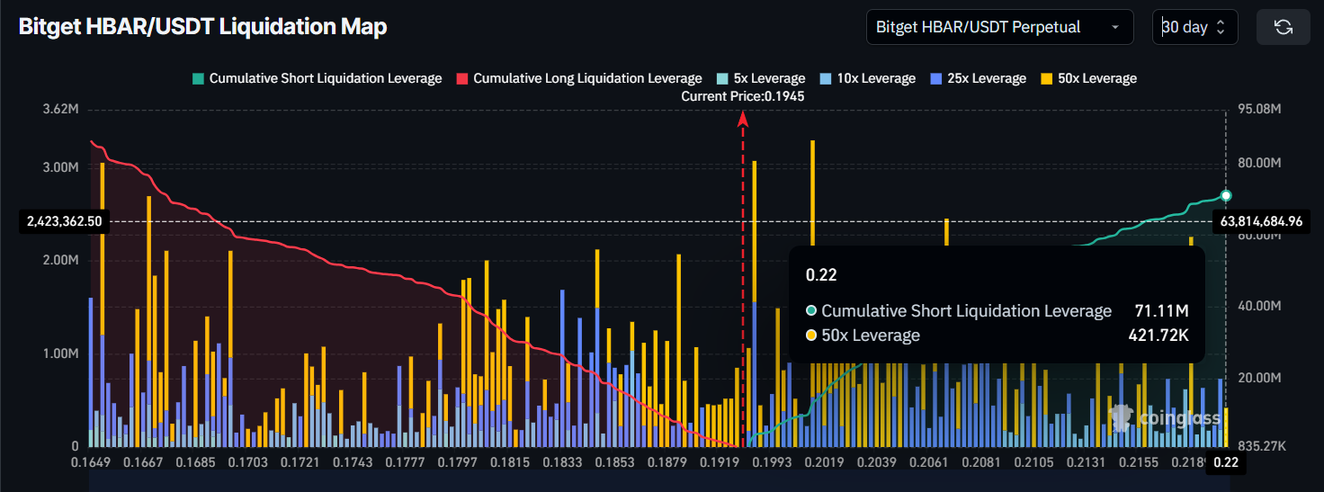 HBAR үшін қысқа позицияларды бақылайтын өтімділік картасы активке қарсы бәс тіккен трейдерлер баға өсе берсе, айтарлықтай шығындарға ұшырауы мүмкін екенін көрсетеді. HBAR-дың қазіргі бағасы 0,19 доллар, 0,22 доллар негізгі қарсылық деңгейінен алыс емес. Егер HBAR осы қарсылықты бұзса, шамамен 70 млн доллар қысқа позициялар өтімділікке ұшырауы мүмкін, бұл одан әрі жоғары қысымға әкеледі. Бұл сценарий бұқа инвесторлар мен аю трейдерлер арасындағы қарқынды күресті көрсетеді.