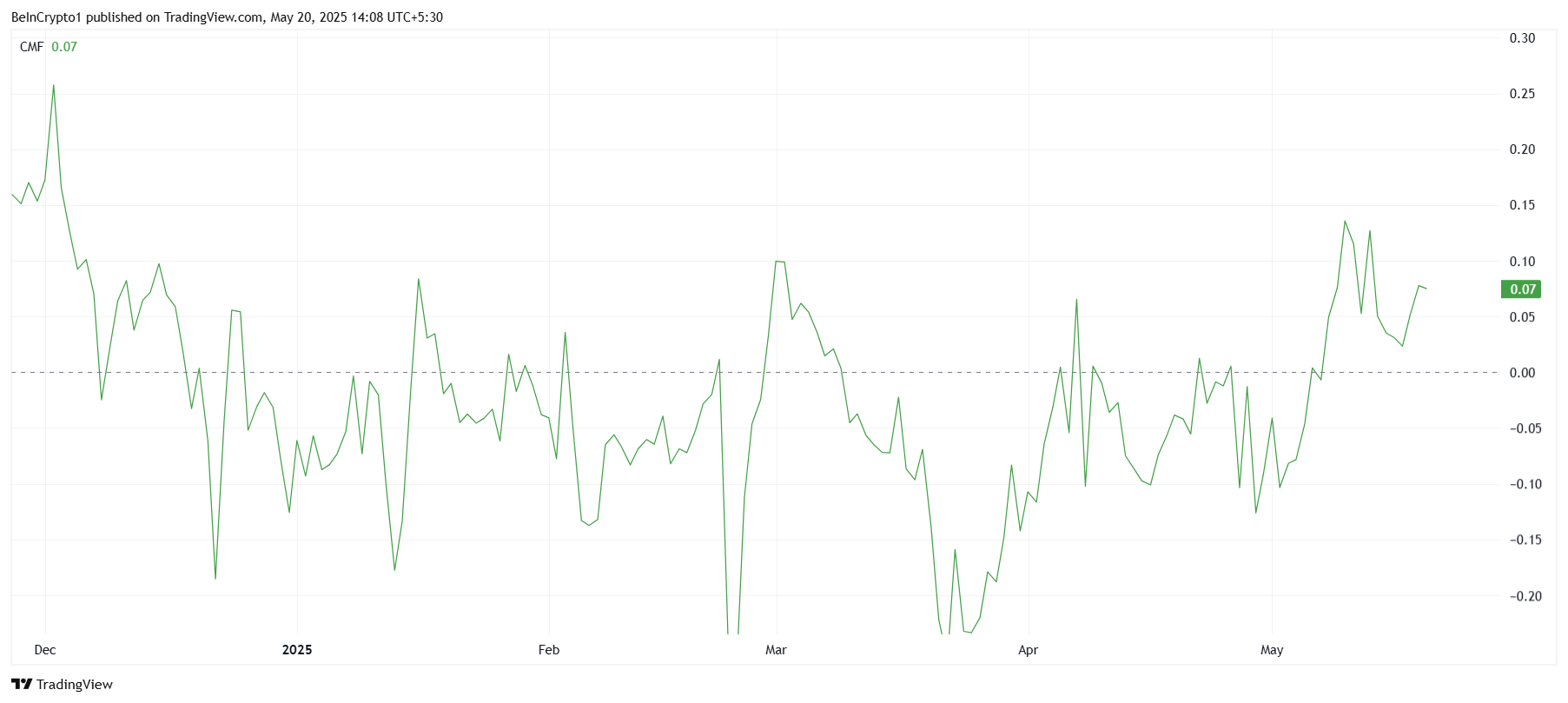 Chaikin Money Flow (CMF) индикаторы HBAR-ға күшті кірістерді көрсетіп, инвесторлардың көңіл-күйі бұқа екенін білдіреді. CMF 2024 жылдың желтоқсанынан бері алғаш рет нөлдік сызықтан жоғары көтеріліп, күшті сұранысты көрсетіп отыр.