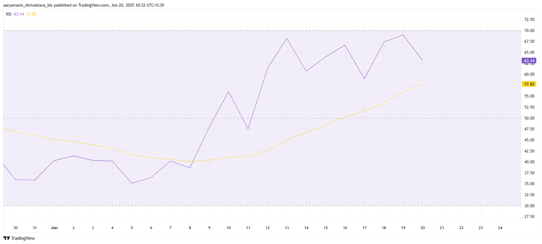 AERO үшін Салыстырмалы күш индексі (RSI) қазір бейтарап сызықтан жоғары орналасқан, бұл бұқа импульсінің әлі де күшті екенін көрсетеді. Бұл оң импульс нарық көңіл-күйінің AERO бағасының әрекеті үшін қолайлы екенін білдіреді. RSI әлі де артық сатып алу аймағына өтпегенімен, бұл уақытша өсу үрдісін қолдай алатын негізгі фактор болып табылады.