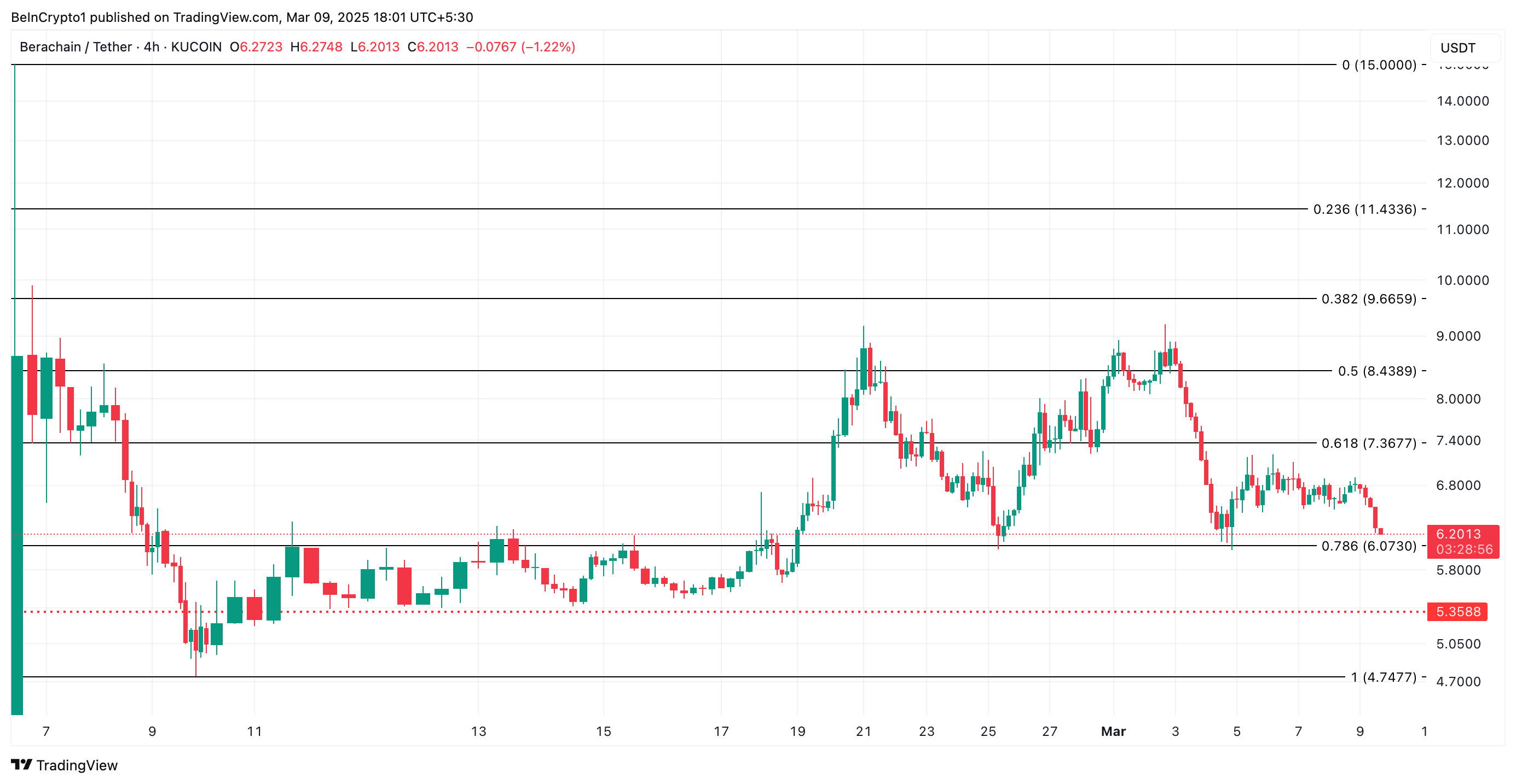 Berachain жазу кезінде 6,14 долларда саудаланып, 6,07 доллардағы қолдаудың сәл үстінде тұр. Егер альткоинге қарсы аюлық көзқарас күшейсе, оның бағасы осы қолдау деңгейінен төмен түсіп, токен 5,35 долларда саудалануы мүмкін.