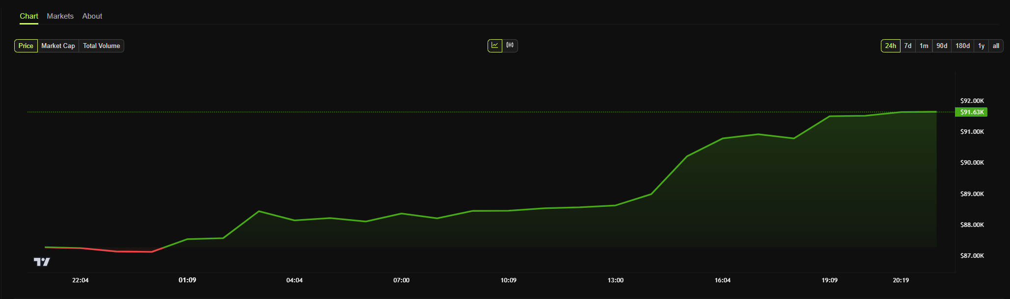 Соған қарамастан, дәстүрлі нарықтар құлдырады, ал BTC 91 000 доллардан жоғары тұрақты болып, жалпы крипто нарығының капитализациясы 2,96 трлн долларды құрады.