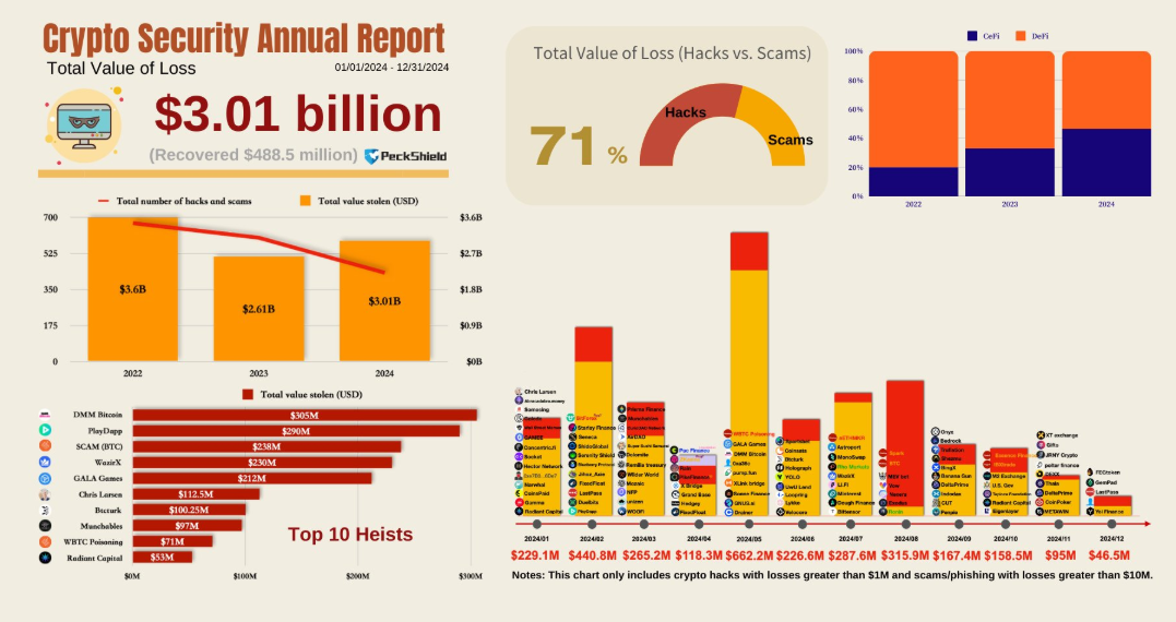 PeckShield талдауы 2024 жылғы шығындардың көпшілігі крипто хакерліктерінен болғанын көрсетеді, олар жалпы соманың $2.15 миллиардын немесе 71% құрады. Қалған $834.5 миллион әртүрлі алаяқтықтардан, мысалы, фишинг шабуылдары, Понци схемалары және жалған инвестициялық платформалардан шыққан.