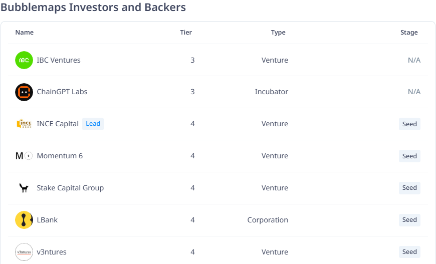 Cryptorank.io деректері бойынша көрсетілгендей, бұл TGE Bubblemaps-тың INCE Capital басшылығымен өткен 3,2 млн долларлық қаржыландыру раундын жалғастырады. Қаржыландыру Bubblemaps-тың аналитикалық мүмкіндіктерін кеңейту және оның зерттеу платформасын дамытуға қолдау көрсетуге бағытталған.