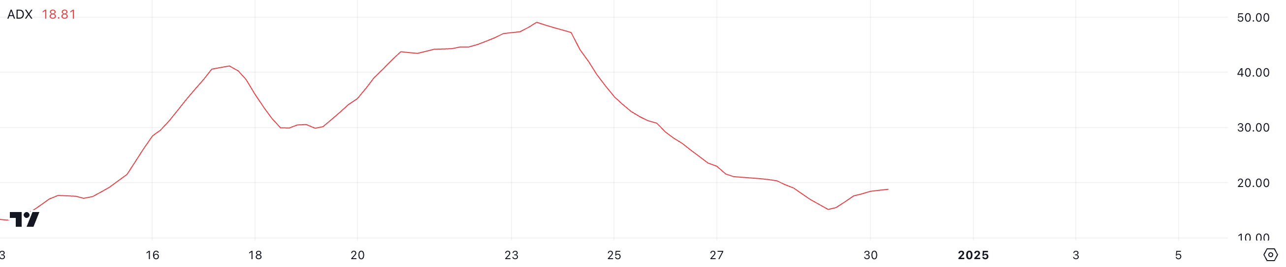 BTC-ның ADX көрсеткіші қазіргі уақытта 18.81-де тұр, бұл жеті күн бұрынғы 50-ге жуық көрсеткіштен айтарлықтай төмендеген. Бұл төмендеу Биткоиннің ағымдағы төмендеу үрдісінің күшінің айтарлықтай әлсіреуін көрсетеді.