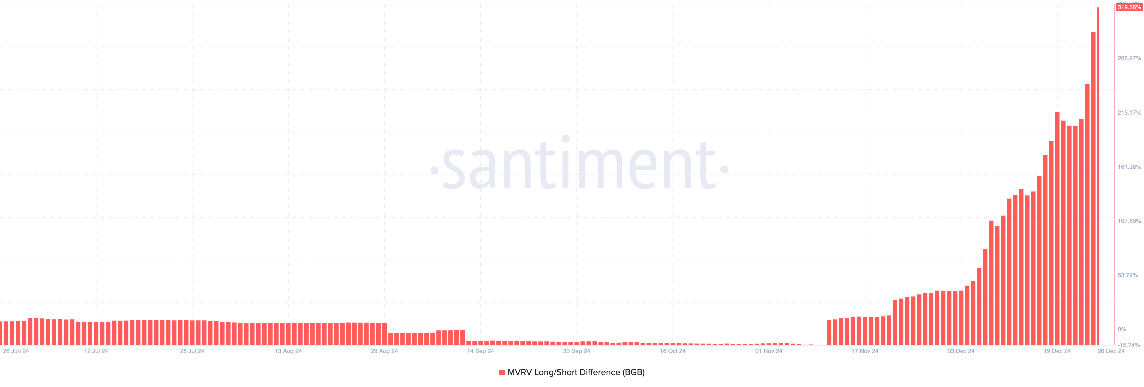 Кейбіреулер үшін бұл BGB тарихи максимумы нарықтың шыңының белгісі болуы мүмкін. Алайда, Santiment-тен алынған тізбектегі деректер бұл олай болмауы мүмкін екенін көрсетеді. Бұл тезисті қолдайтын бір көрсеткіш – Нарықтық Құнның Реализацияланған Құнға (MVRV) Ұзақ/Қысқа Айырмашылығы.