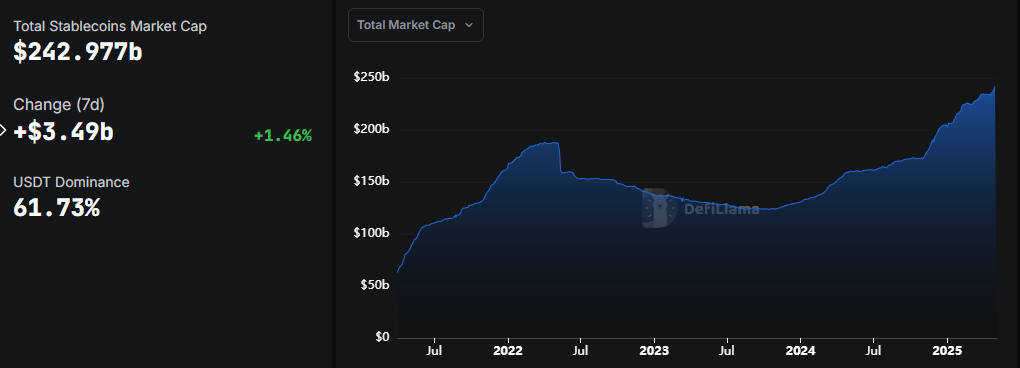 Бұл графикте стейблкоин нарықтық капитализациясы 2025 жылы шамамен 40 млрд долларға өскенін көрсетеді, 1 қаңтарда 203,372 млрд доллардан осы жазбаға сәйкес 242,977 млрд долларға дейін көтерілді. Бұл бес айдан аз уақыт ішінде 19,47%-ға өскенін білдіреді.