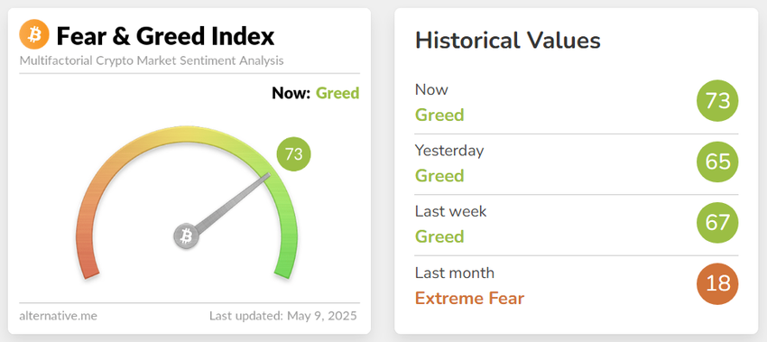 Тағы бір назар аударарлық дерек нүктесі — Crypto Fear & Greed Index. Ол 73-ке көтеріліп, «Ашкөздік» аймағына кірді — бұл екі айдағы ең жоғары деңгейі. Бұл инвесторлардың көңіл-күйі сақтықтан толқуға ауысып жатқанын көрсетеді.