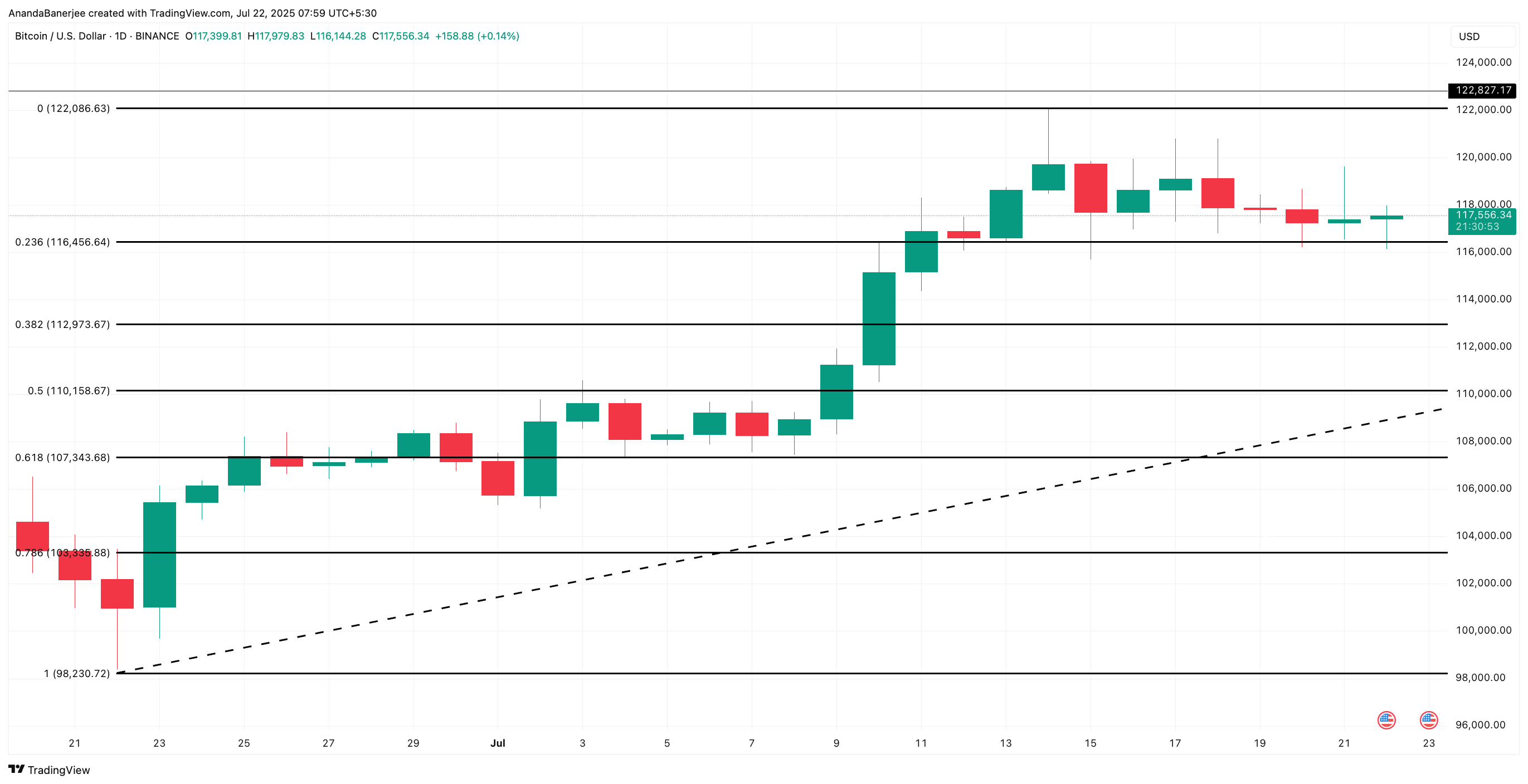 Баға құрылымы тұрғысынан, Bitcoin қазіргі уақытта 117 500 доллар шамасында саудаланып, шешімсіздік белгілерін көрсетуде. 12 шілдеден бастап, баға бірнеше рет 116 456 доллар деңгейін сынап, құрметтеп келеді, бұл 98 230 доллардан 122 086 доллар тарихи максимумға дейінгі соңғы импульстік қозғалыстың 0,236 Фибоначчи түзетуімен сәйкес келеді.