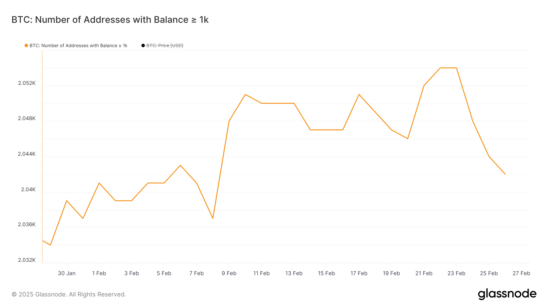 Кем дегенде 1 000 BTC ұстайтын мекенжайлар ретінде анықталған Bitcoin киттерінің саны 22 ақпанда 2 054 шыңына жеткенге дейін тұрақты өсу көрсетті.