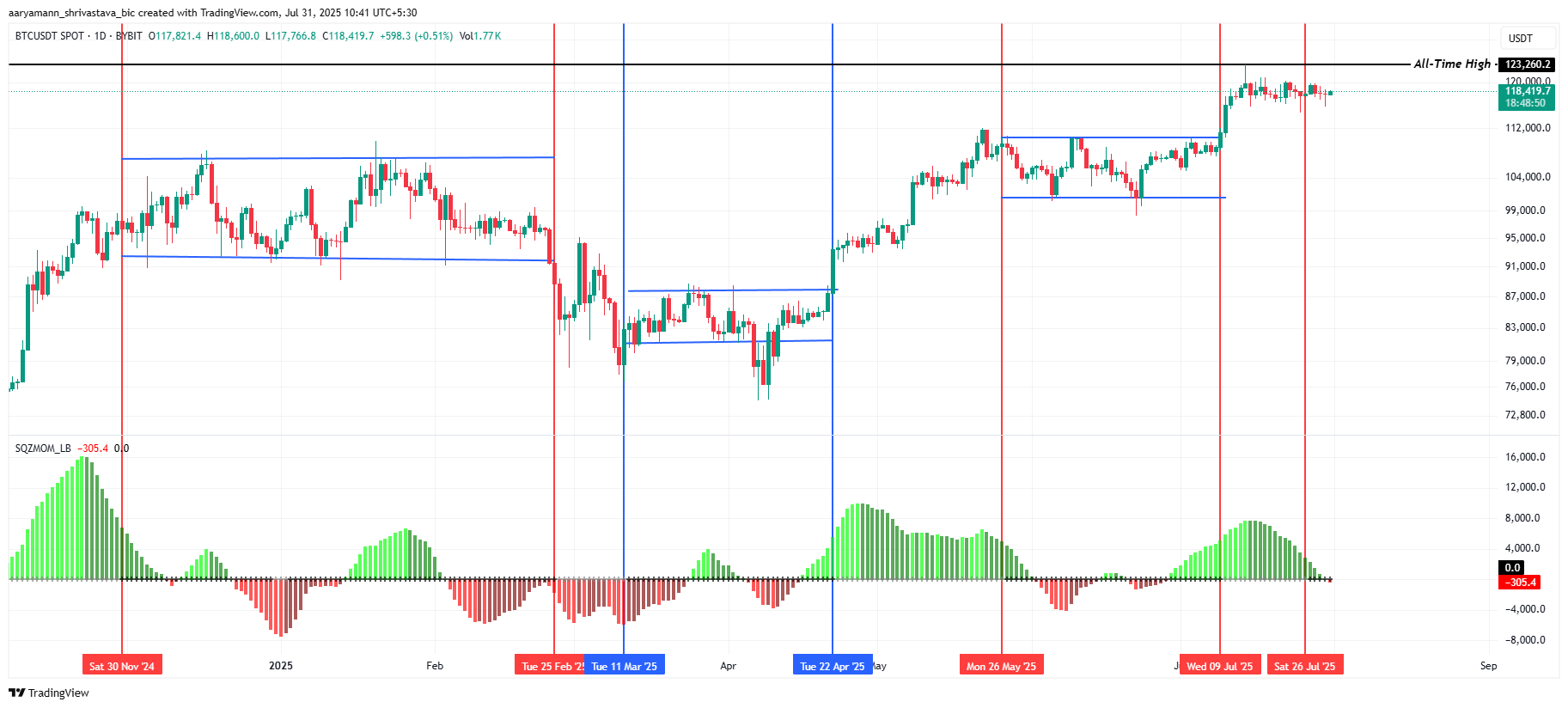 Қазіргі уақытта Bitcoin бағасы $118 419, $115 700-ге дейін төмендегеннен кейін аздап қалпына келді. Осы қалпына келуге қарамастан, сатылым қысымы сияқты факторларға байланысты Bitcoin-ның жолы әлі де белгісіз болып тұр.