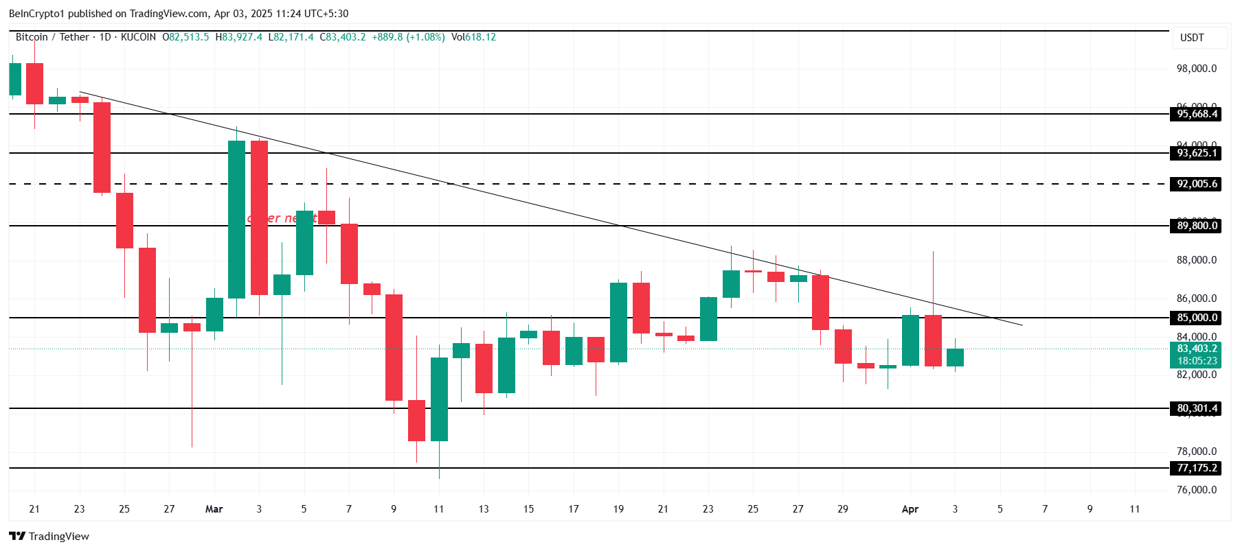 Жазу кезінде биткоин бағасы 83 403 долларды құрап, 85 000 доллар маңызды қарсылық деңгейінен сәл төмен тұр. Осы аптада биткоин 88 500 долларға дейін көтерілді, бірақ Трамптың Азаттық күні тарифтері жарияланғаннан кейін төмендеді. Бұл нарықтық көңіл-күйдің уақытша төмендеуіне әкелді, бірақ баға 80 000 доллардан жоғары тұрақтанды.