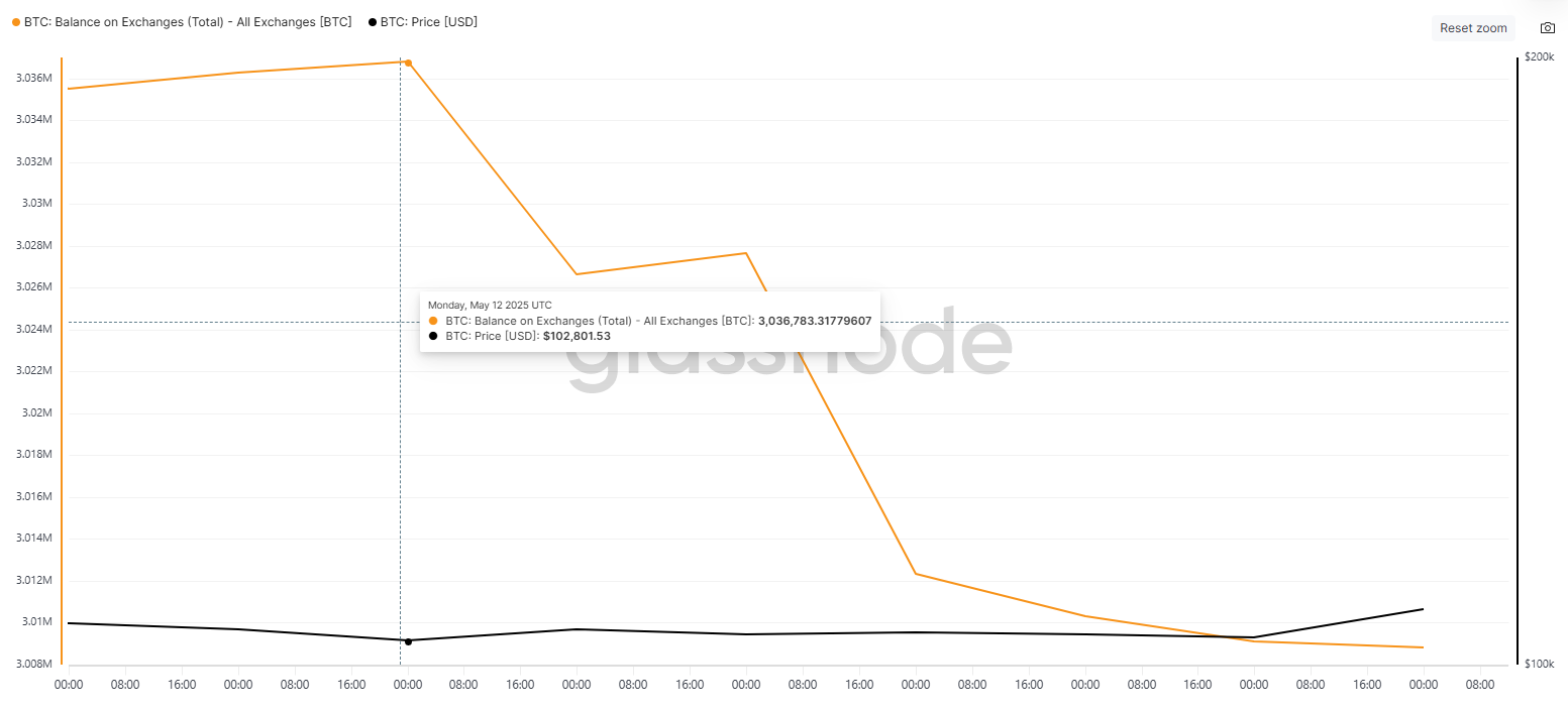 Биржалардағы баланстардың үздіксіз төмендеуі жинақтау үлгісін көрсетеді. Өткен аптада инвесторлар 27 976 BTC-ден астам, құны 2,88 млрд доллардан астам сатып алды. Бұл қолжетімді ұсынысты шамамен 3 млн BTC-ге дейін азайтты.