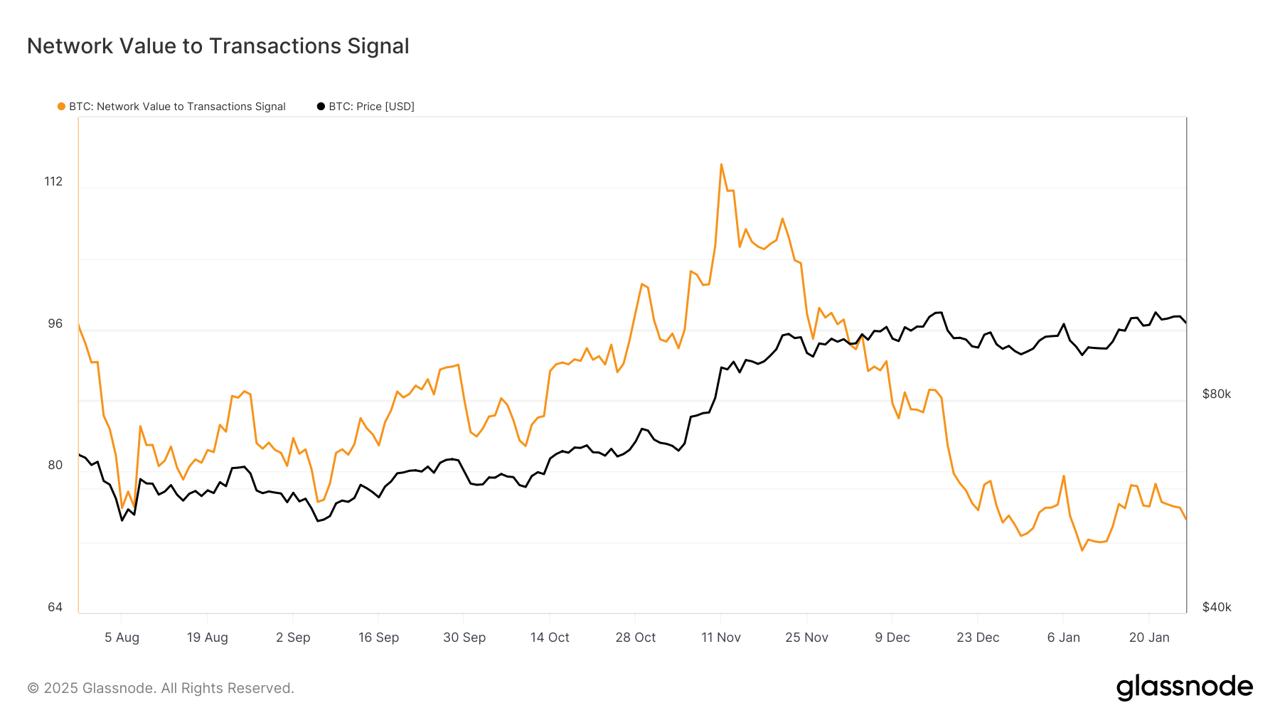 NVT сигналы оң көзқарас берсе де, BTC-ның күшін қалпына келтіру үшін кеңірек нарықтық белгілер сәйкес келуі керек. Инвесторлар қазіргі уақытта нақты аюлы емес, бұл қолайлы жағдайлар, мысалы, сатып алу белсенділігінің артуы немесе экономикалық дамулар пайда болса, көңіл-күйдің тез жақсаруын ұсынады.