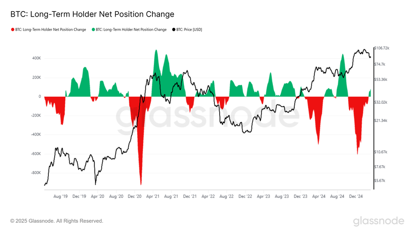 Ұзақ мерзімді иелер (LTHs) сатудан жинақтауға ауысты, бұл LTH таза позиция өзгерісі метрикасымен көрсетілген. Соңғы 30 күнде бұл инвесторлар 107 413 BTC-ден астам жинақтады. Тарихи тұрғыдан алғанда, LTH жинақтауы ұзақ мерзімді сенімділікті білдіреді, бірақ қысқа мерзімде бұл жиі баға әлсіздігі кезеңдерінен бұрын болған.