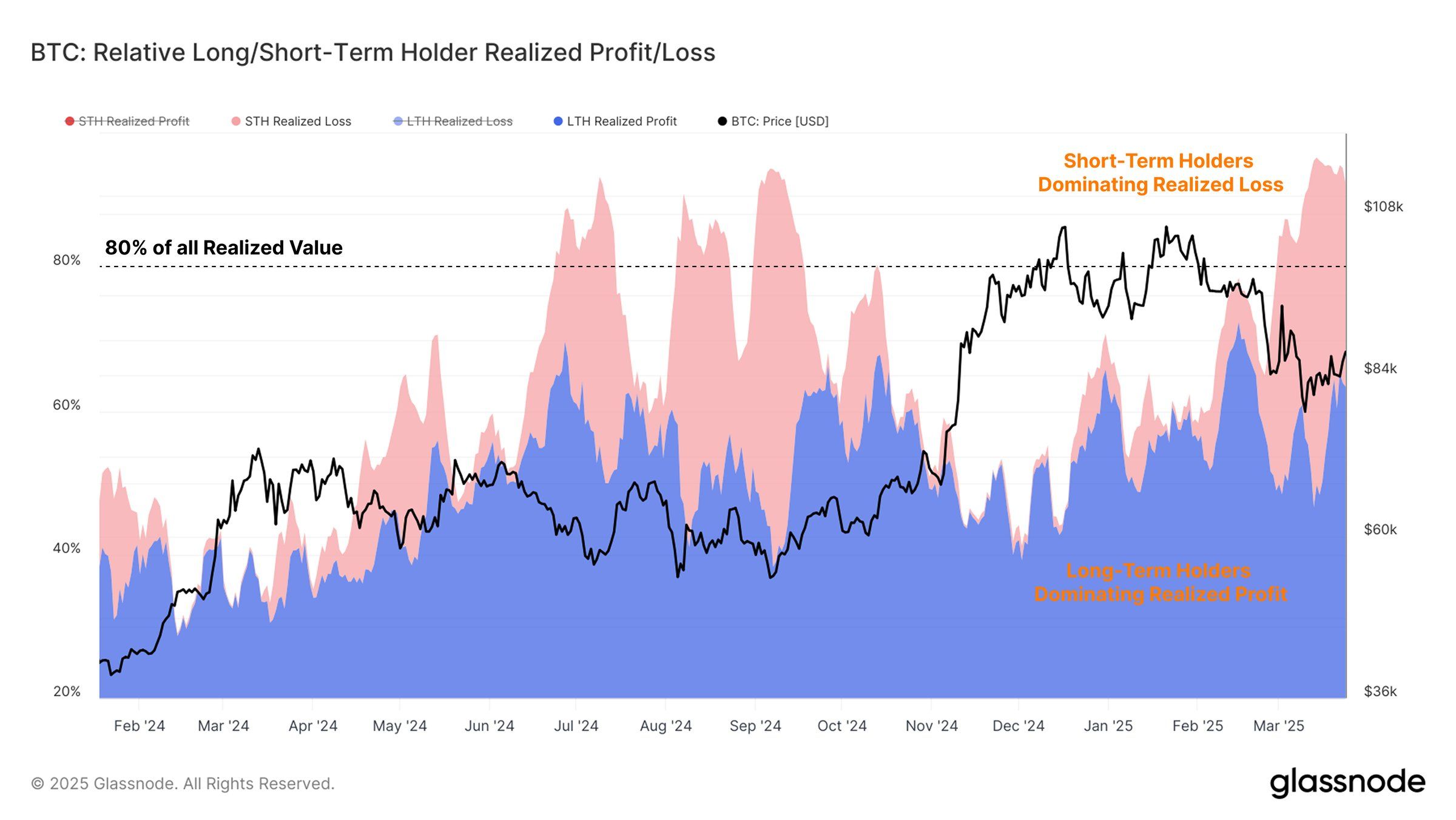 Жоғары бағамен сатып алатын қысқа мерзімді иелер (STHs) ағымдағы шығындарға негізінен жауапты. Бұл инвесторлар Биткоиннің құбылмалы нарық жағдайларына жауап ретінде шығындарды белсенді түрде белгілеп отыр, бұл жаңа инвесторлар үшін қиындық тудыратын болжамсыз ортаны көрсетеді.