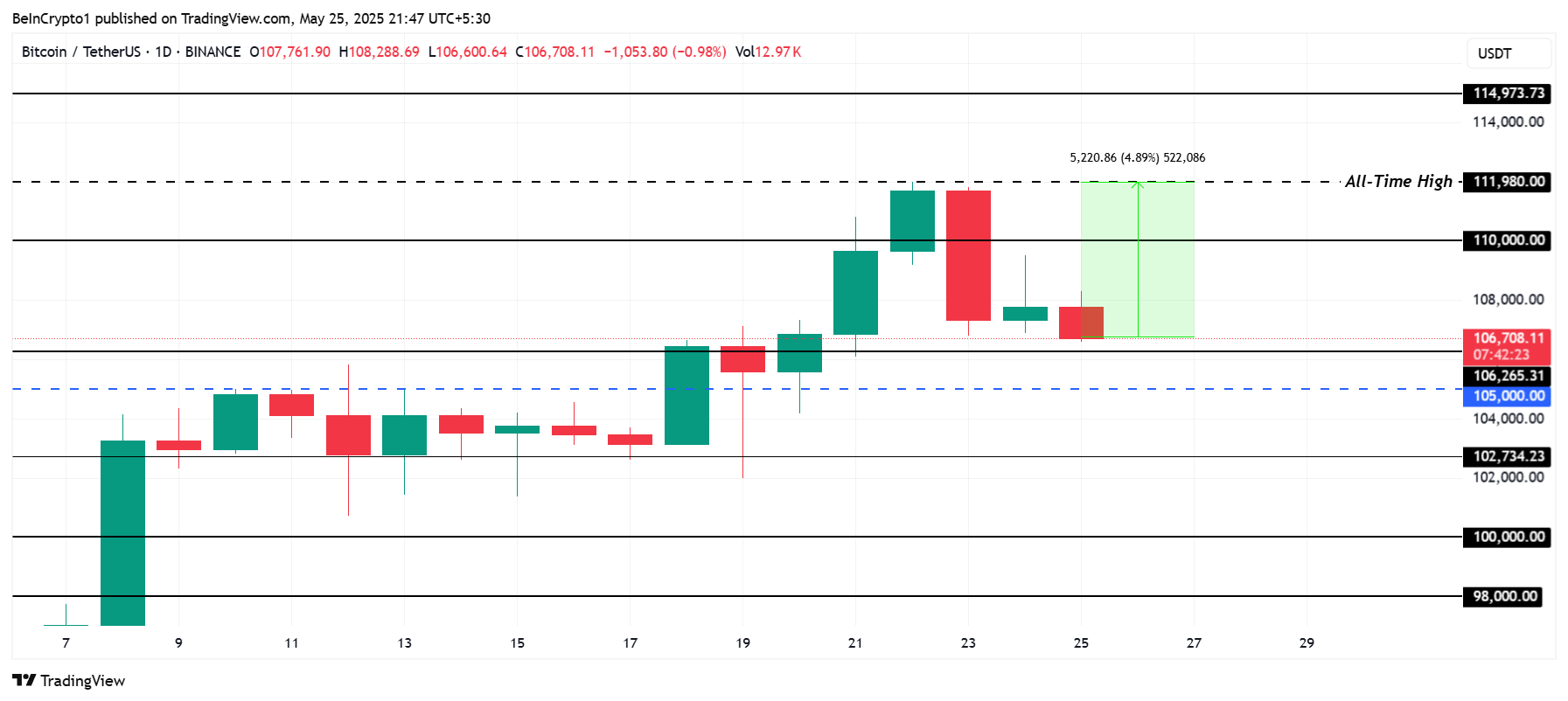 Алайда, егер Bitcoin 106 265 доллардан жоғары ұстап, сатып алу қызығушылығын қайта көрсе, бұл аюлы болжамды оңай жоққа шығара алады. 110 000 доллар қарсылық деңгейін бұзу 111 980 доллардан өту үшін қажетті импульсті қамтамасыз етіп, жаңа ATH-ға жол ашады.