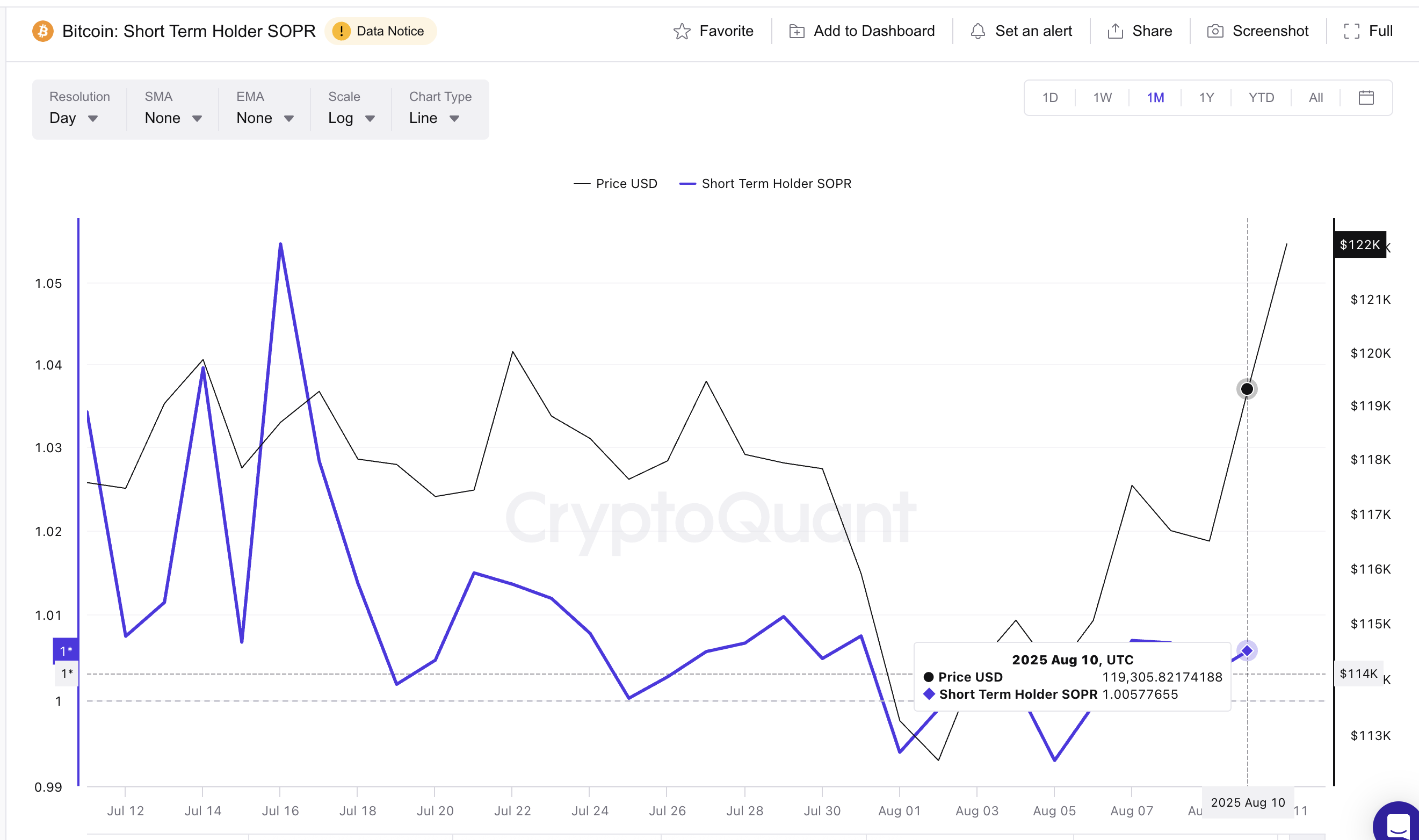 Қысқа мерзімді иелердің жұмсалған шығыс пайда коэффициенті (SOPR) монеталардың он-чейнде қозғалған кезде пайдамен немесе шығынмен сатылып жатқанын өлшейді. Қысқа мерзімді SOPR тым жоғары көтерілгенде, бұл агрессивті пайда алуды білдіреді, көбінесе жергілікті шыңдардың алдында болады.