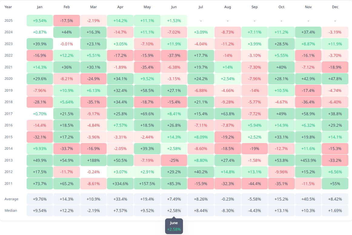 Bitcoin-ның тарихи айлық қайтарым деректері маусым айының әдетте актив үшін оң ай болғанын көрсетеді, однағы орташа өсім – 2,58%. Бұл Bitcoin қысқа мерзімді түзетулерге тап болуы мүмкін екенін көрсетеді, бірақ кеңірек нарықтық үрдіс бағаның қалпына келуін қолдауы мүмкін.