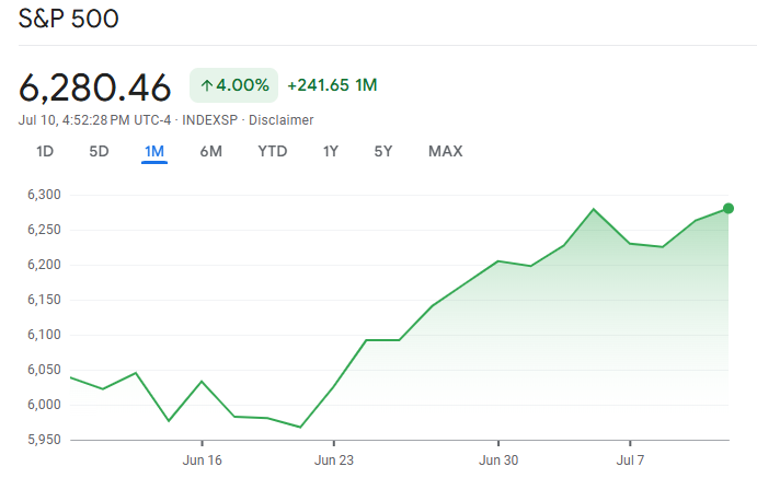 S&P 500 сәуір 2025 жылғы төменгі деңгейінен 30%-ға өсті, осы аптада жаңа тарихи максимумға жетті. Бұл жоғары өсу мен жоғары тәуекелді активтерге инвесторлардың сенімінің күшті екенін көрсетеді.