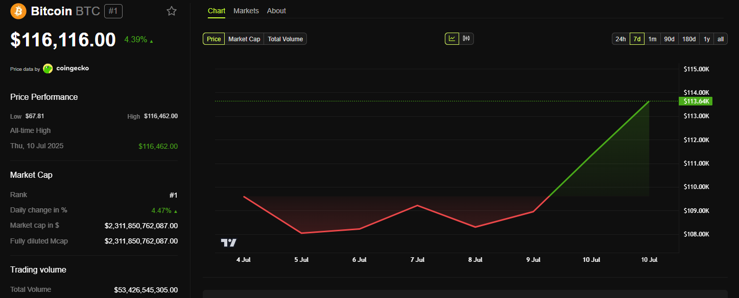 Bitcoin 10 шілдеде 116 000 долларға жетіп, тарихи максимумға көтерілді, бұл Дональд Трамптың Үлкен Әдемі Заңға қол қойғанынан алты күн өткен соң болды. Негізгі криптовалюта заңға қол қойылғаннан бері 6%-ға өсті, Ethereum және басқа альткоиндер де артта қалмай келеді.