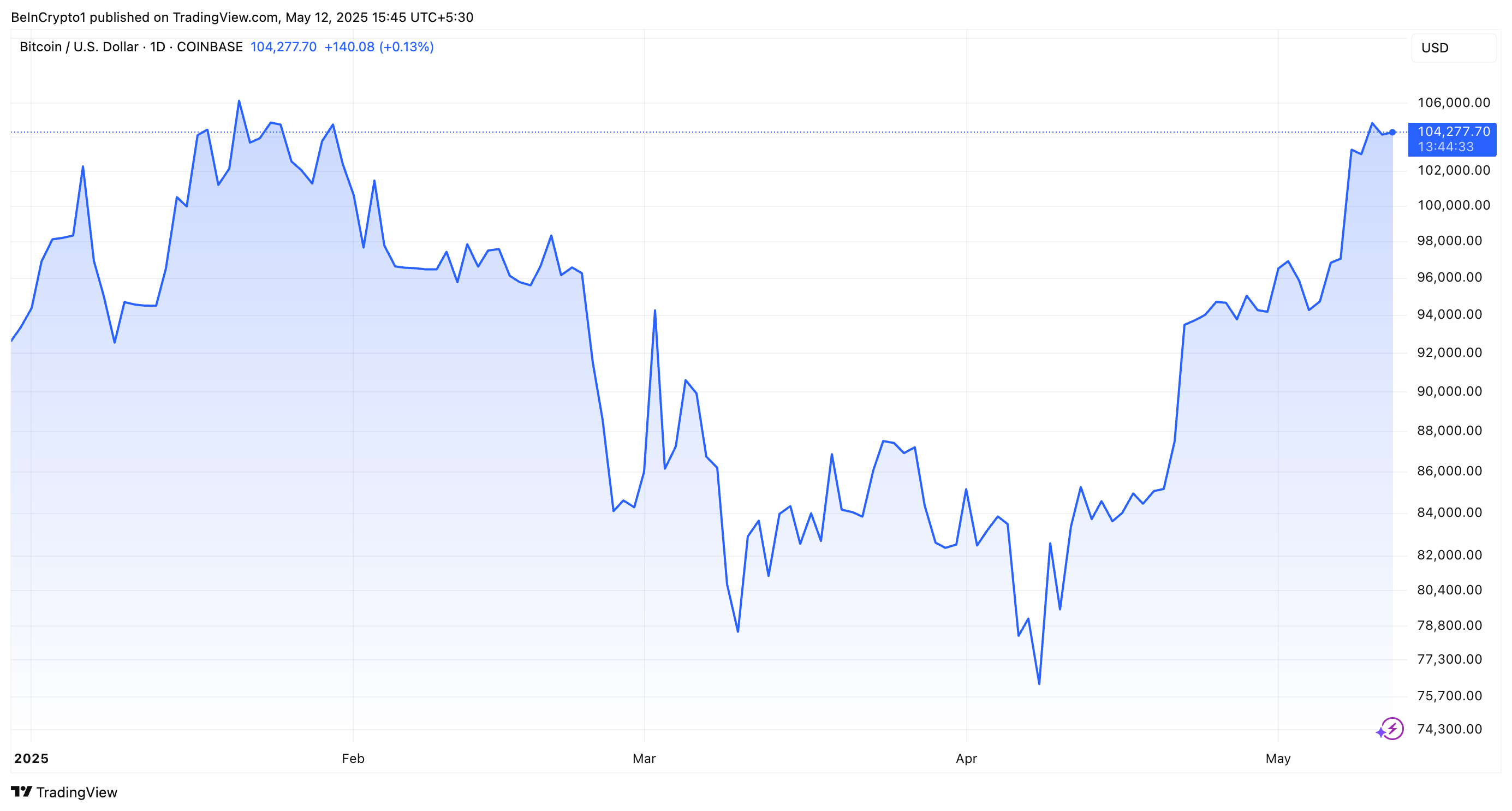 Жазу кезінде BTC бағасы 104 277 долларға түзетілді, бұл оның 108 786 доллар тарихи максимумынан небәрі 4,0%-ға төмен.