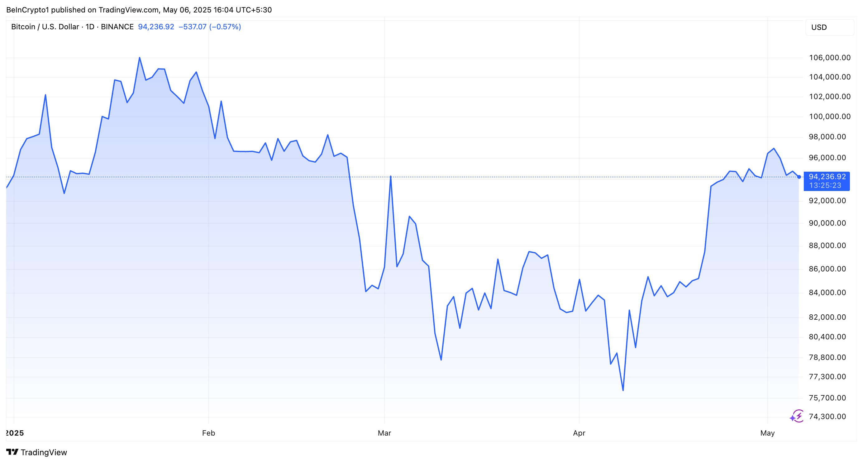 Сонымен қатар, Bitcoin баспасөз уақытында 94 236 доллар деңгейінде саудаланды, соңғы күнде 0,1%-ға төмендеді. Ол өзінің рекордтық деңгейінен 13,4%-ға төмен болып қалды. Монета бұл алшақтықты толтыра ма әлі белгісіз.