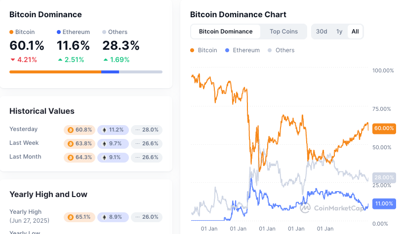Нарық динамикасы портфельді баламалы криптовалюталарға қайта теңестірудің жеделдеп жатқанын көрсетеді. Тақырыптық токендер кеңірек альткоин импульсімен қатар айтарлықтай өсулерді бастан кешірді. Үстемдік коэффициенті 01:00 UTC уақытында 60,1%-ға қалпына келді.