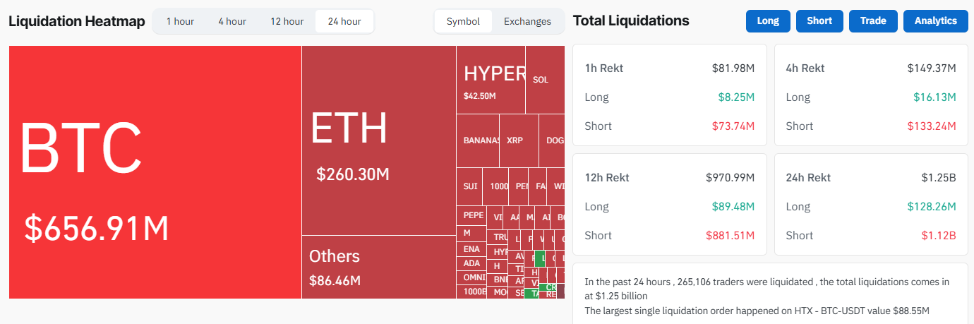 CoinGlass-тың өтімділік деректеріне сәйкес, жалпы нарықтық өтімділіктер соңғы 24 сағат ішінде 1,25 млрд доллардан асты. Оның ішінде 1,12 млрд доллар қысқа позициялардан келді. Биткоинның өзі 656 млн доллардан астам өтімділіктерді көрді.