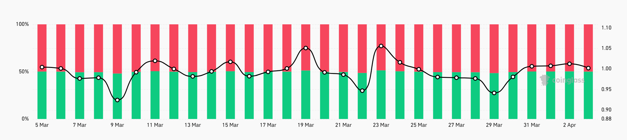 Өткен аптада активтің ұзын-қысқа қатынасы 0,94 болды, ал бүгін ол 1-ге ауысты. Бұл инвесторлардың позицияларын теңестіруге қарай қозғалысты білдіреді.
