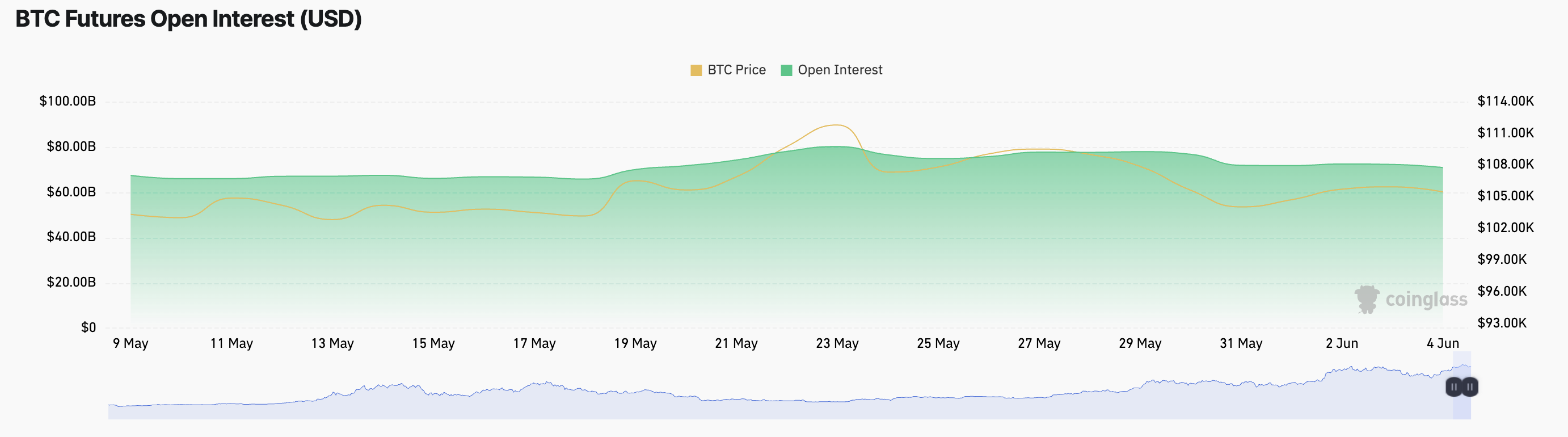 Ашық қызығушылық әлі шешілмеген немесе жабылмаған белсенді фьючерстер немесе опциондар келісімшарттарының жалпы санын өлшейді. BTC бағасы бүйірлік сауда диапазонында тұрып қалғанда, трейдерлер позицияларын жауып, нарықтан шегініп жатыр, бұл белгісіздік немесе сенімсіздікке байланысты.