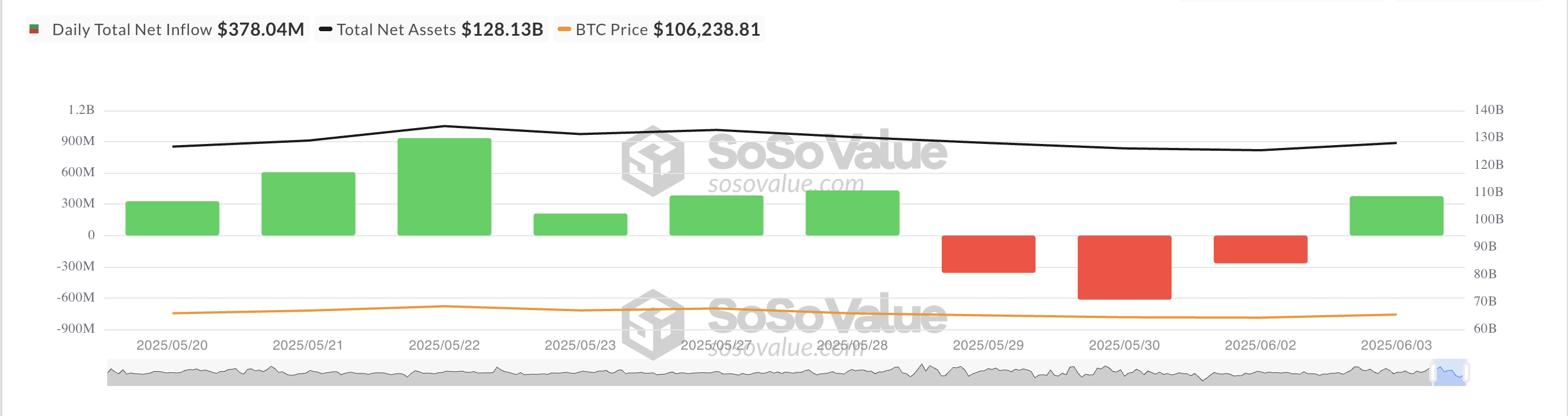 SosoValue мәліметтері бойынша, сейсенбі күні инвесторлар BTC-мен қамтамасыз етілген қорларға 378,04 млн доллар жаңа капитал құйып, барлық BTC спот ETF-тердің жалпы таза актив құнын 128,13 млрд долларға жеткізді.