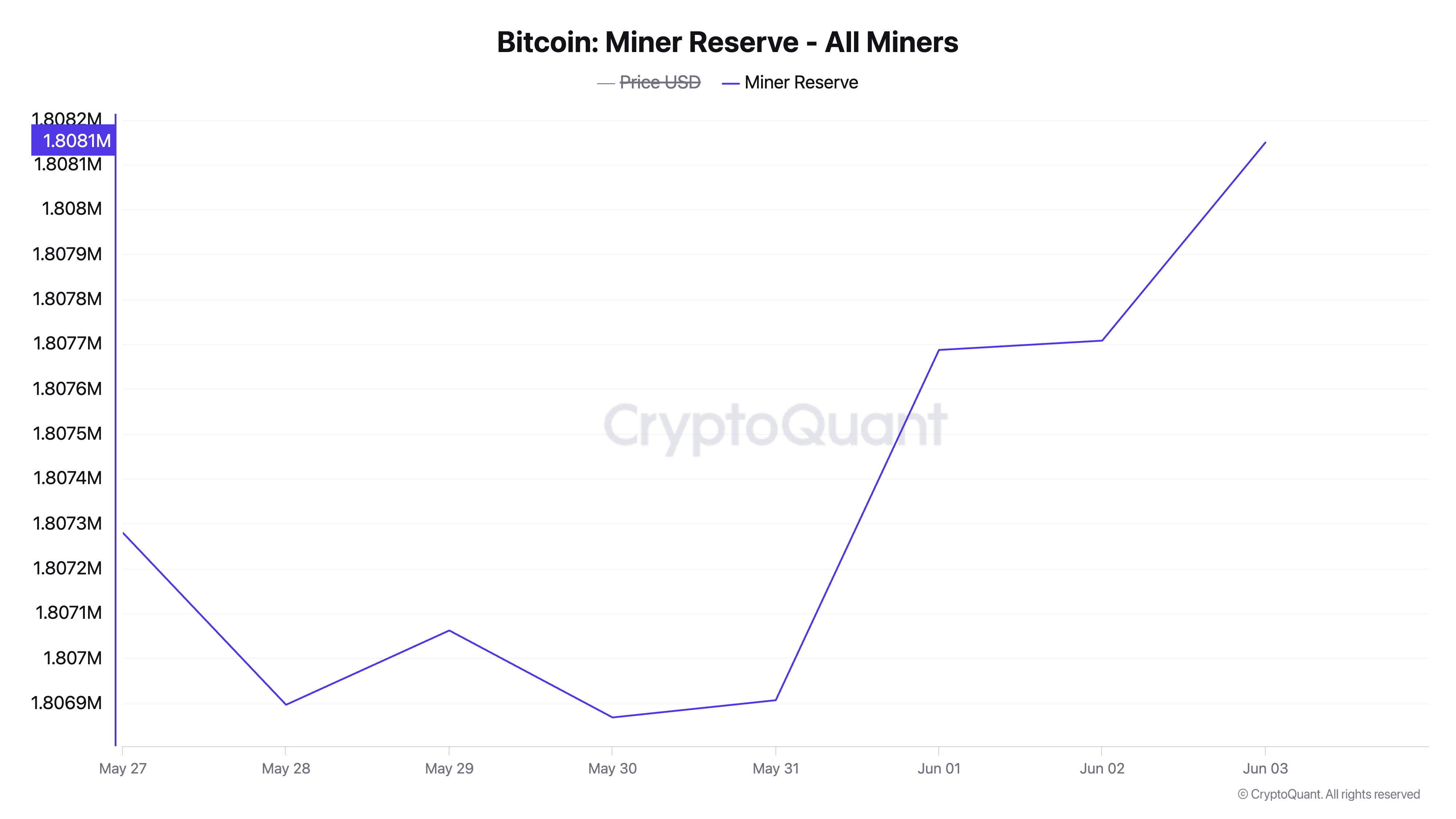 Бұл жазу кезінде, BTC майнер резерві 1,8 млн монетаны ұстап тұр, өткен аптада 1 556 BTC қосылды. Майнер резерві осылайша көтерілгенде, желідегі майнерлер өздерінің өндірілген монеталарын сатудың орнына ұстап отыр. Бұл әрекет бұқа көңіл-күйін білдіреді, өйткені майнерлер жақын арада жоғары бағаларды күтеді.