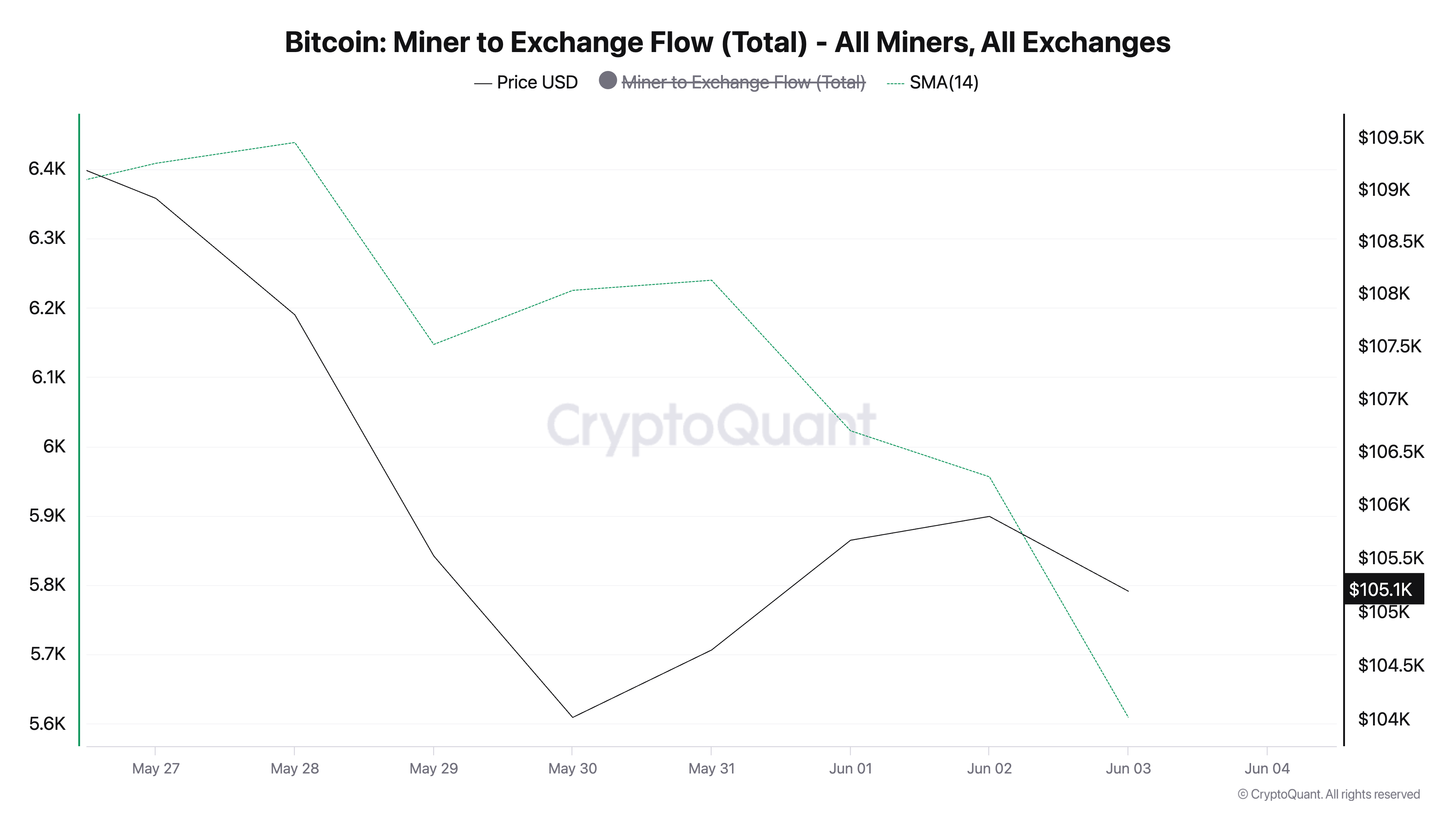 Сонымен қатар, BTC-нің Майнерден-Биржаға Ағыны—майнер әмияндарынан биржаларға жіберілген монеталардың жалпы санын өлшейтін көрсеткіш—төмендеді. 14 күндік шағын жылжымалы орташа мәнде байқалғандай, ол соңғы жеті күнде 14%-ға төмендеді.