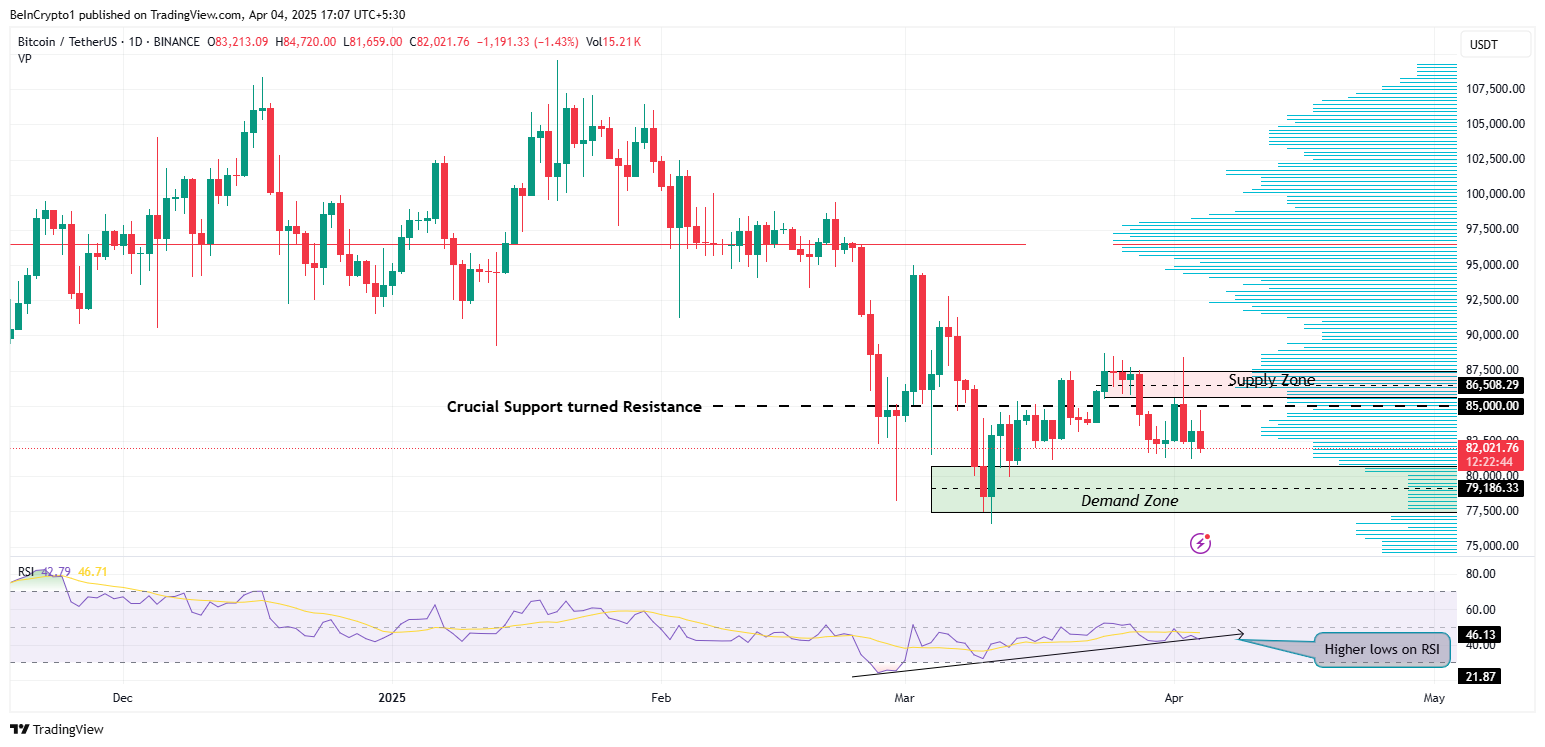 Төменгі жағында 77 500 доллар мен 80 708 доллар арасындағы негізгі сұраныс аймағы қолдау көрсетеді. Баға консолидациясына қарамастан, Салыстырмалы күш индексі (RSI) жоғары төменгі нүктелерді қалыптастырып, тұрақты өсіп келе жатқан импульсті және ықтимал кері бұрылуды көрсетеді.