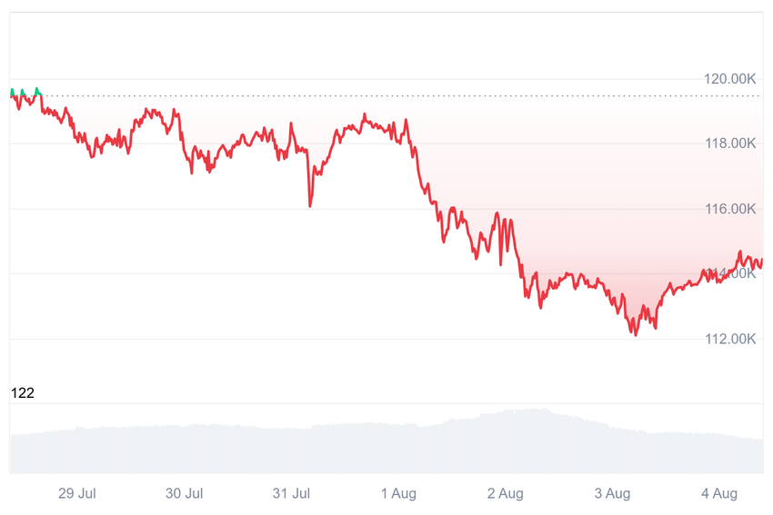 Тамыз айында крипто нарығы қиындықпен басталды. Өткен аптада биткоин бағасы күрт төмендеп, 11 шілдеден бері орнатылған 117 000–120 000 доллар диапазонынан төмен түсті. Биткоин апта ішінде шамамен 4%-ға төмендеді, ал кейбір альткоиндер 15%-дан астам құлдырады.