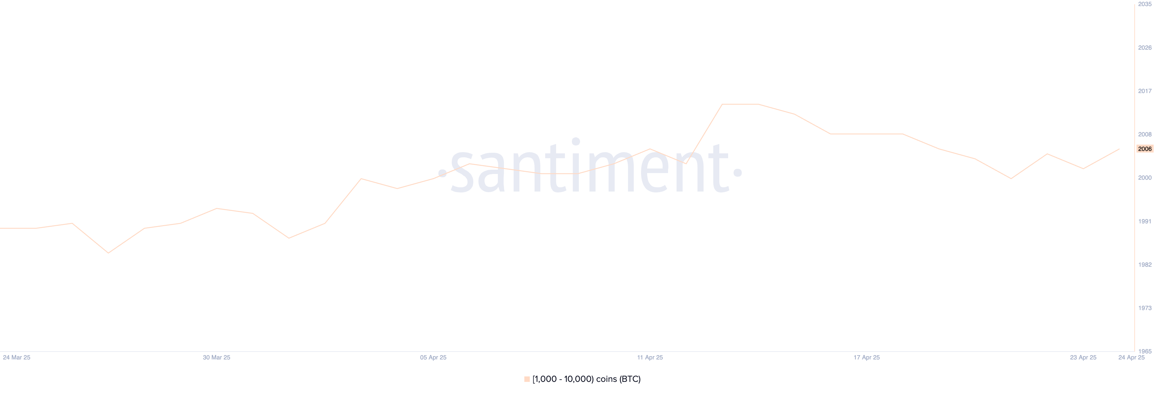 2 006 BTC кит мекенжайлары бар, бұл 21 сәуірде тіркелген 2 000-нан сәл жоғары. Сан 22 сәуірде 2 005-ке дейін көтеріліп, келесі күні 2 002-ге дейін төмендеді, ал қазір ол қайтадан сол деңгейден жоғары.