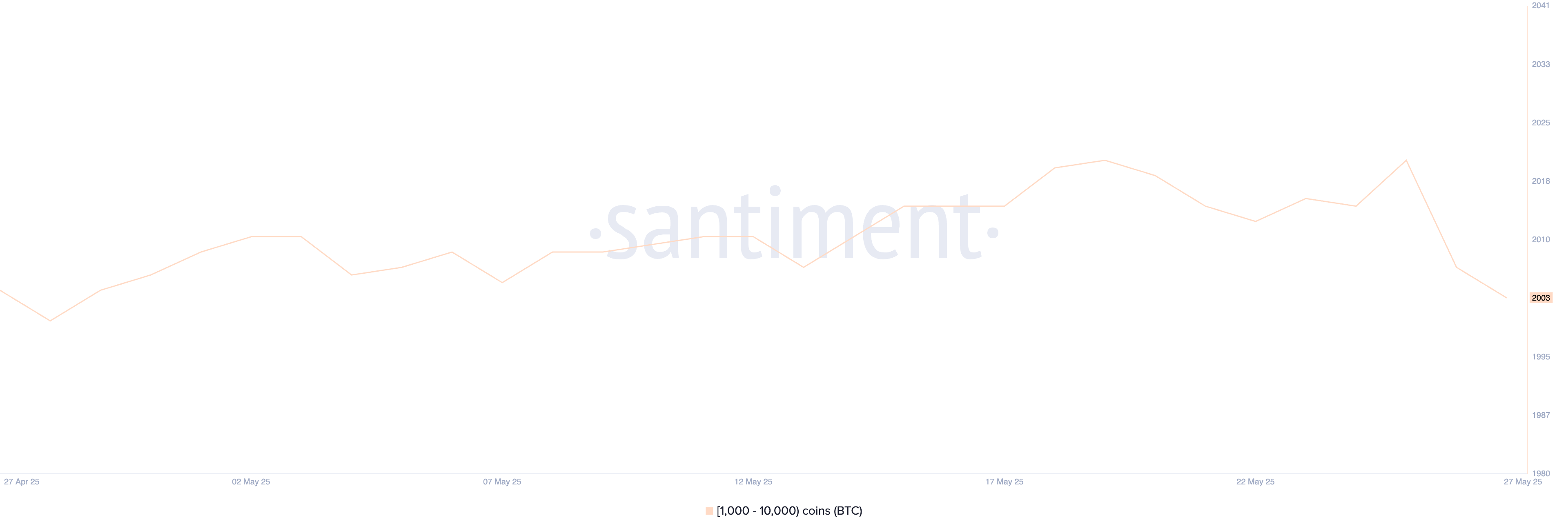 Bitcoin киттерінің, яғни 1,000-нан 10,000-ға дейін BTC ұстайтын әмияндар саны, 25 мамырда 2,021-ге жетіп, соңғы бір жылдағы ең жоғары деңгейге жетті.