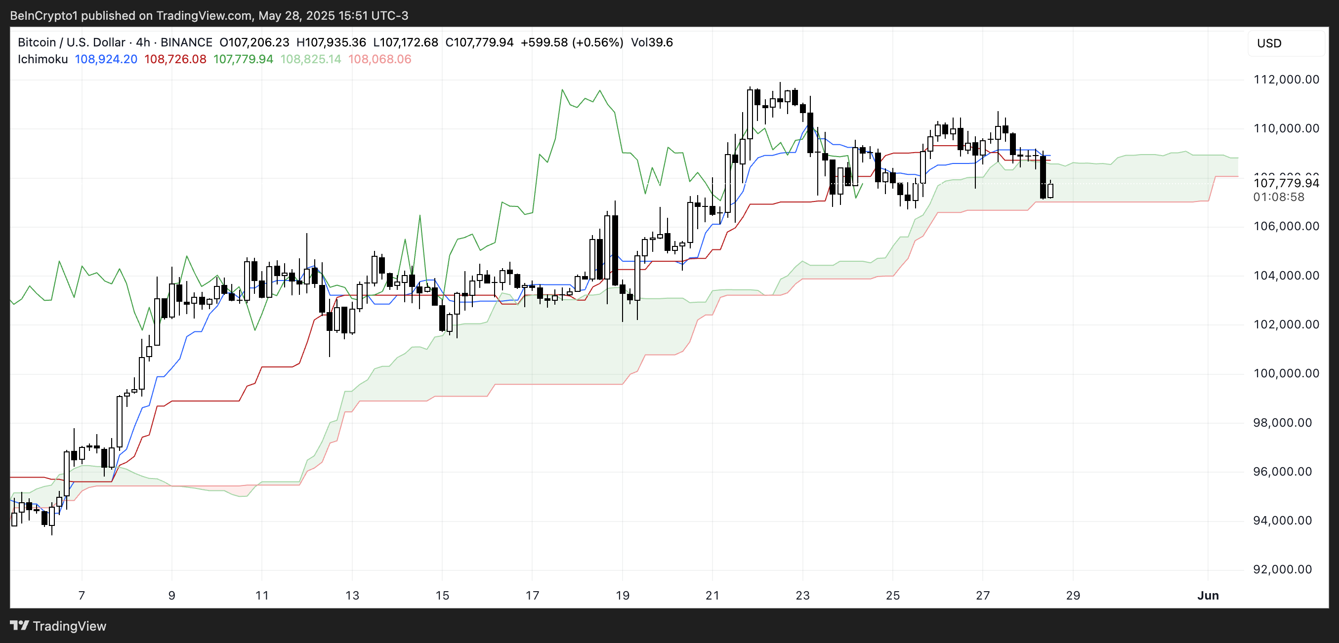 Бұл әдетте бұқа сигналы болып табылады. Алайда, Bitcoin бағасы жасыл Kumo (бұлт) ішіне түсті, бұл белгісіздік пен ықтимал консолидацияны білдіреді.