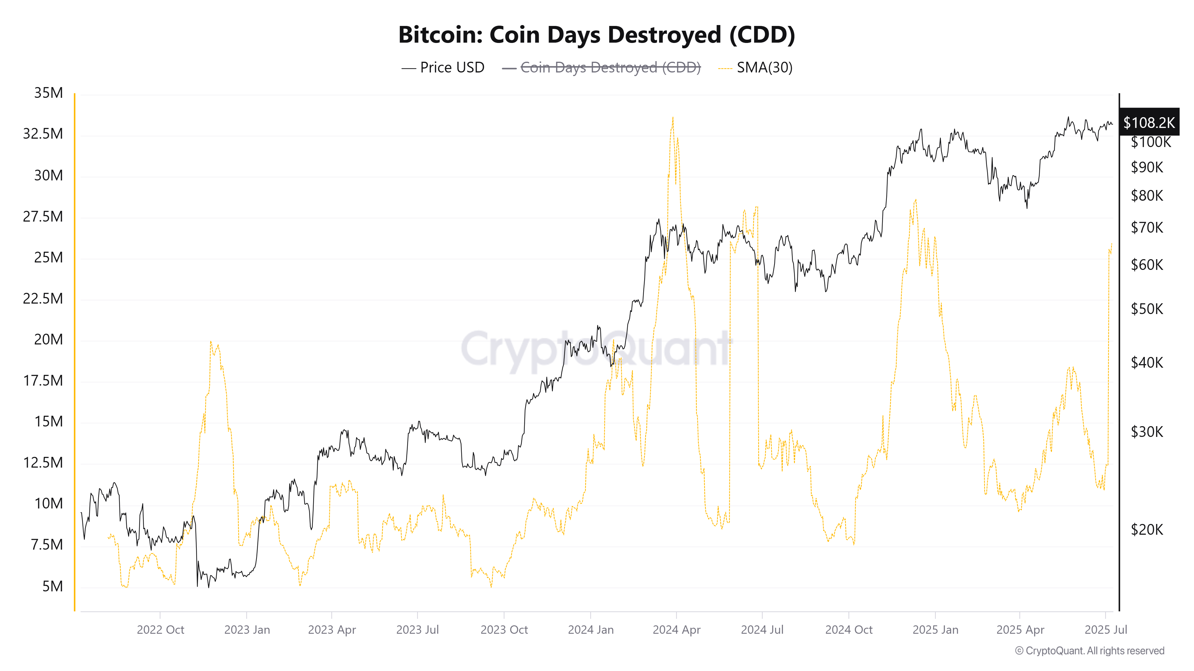Бұл көрсеткіш маңызды, себебі ол ұзақ мерзімді иелердің не істеп жатқанын көрсетеді. Бұл инвесторлар әдетте Bitcoin нарық циклдарын жақсы түсінеді. CDD көтерілгенде, бұл көбінесе ескі иелердің сатылымға шыққанын білдіреді, бұл көптеген адамдар үшін аю белгісі болып саналады.