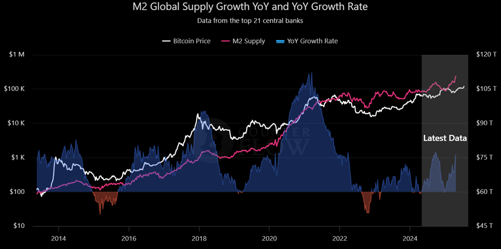 Бұқа тезисін одан әрі қолдай отырып, жаһандық M2 ақша ұсынысы Bitcoin-ге қатысты 12 жылдық ең жоғары деңгейге жетті.