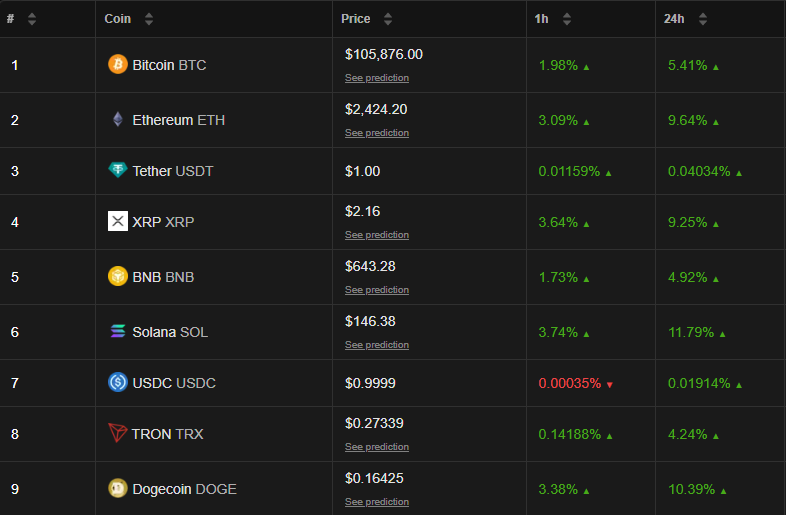 Ethereum да көтеріліп, 2 400 доллардан жоғары деңгейге жетті, ал кеңірек цифрлық активтер нарығындағы тәуекел көңіл-күйі жақсарды.