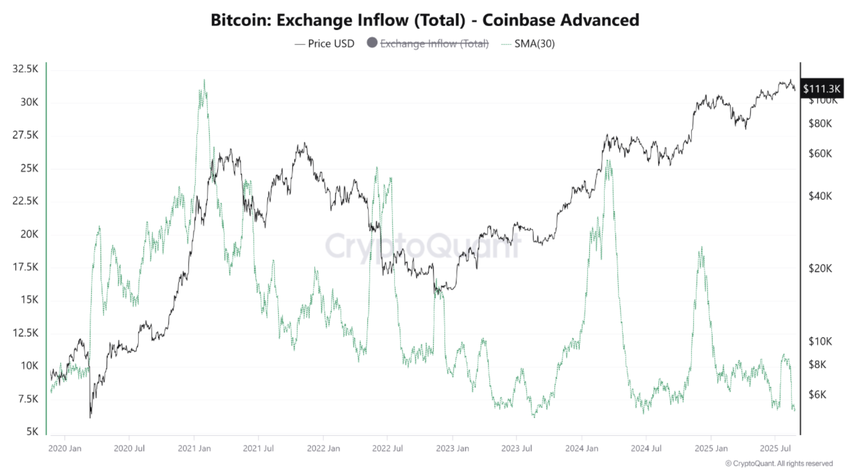 Coinbase Advanced сатылым қысымының төмен екенін көрсетіп, күрт төмендеуді көрсетеді. Бұл АҚШ бөлшек және институционалдық инвесторларынан келеді.