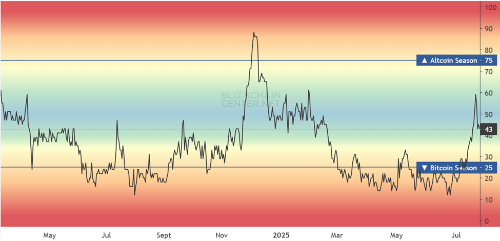 Altcoin Season Index 43-те, крипто индустриясы әлі альтсезонда емес екенін көрсетеді. Алайда, өсіп келе жатқан траектория нарық импульсінің өзгеруін одан әрі қолдайды.