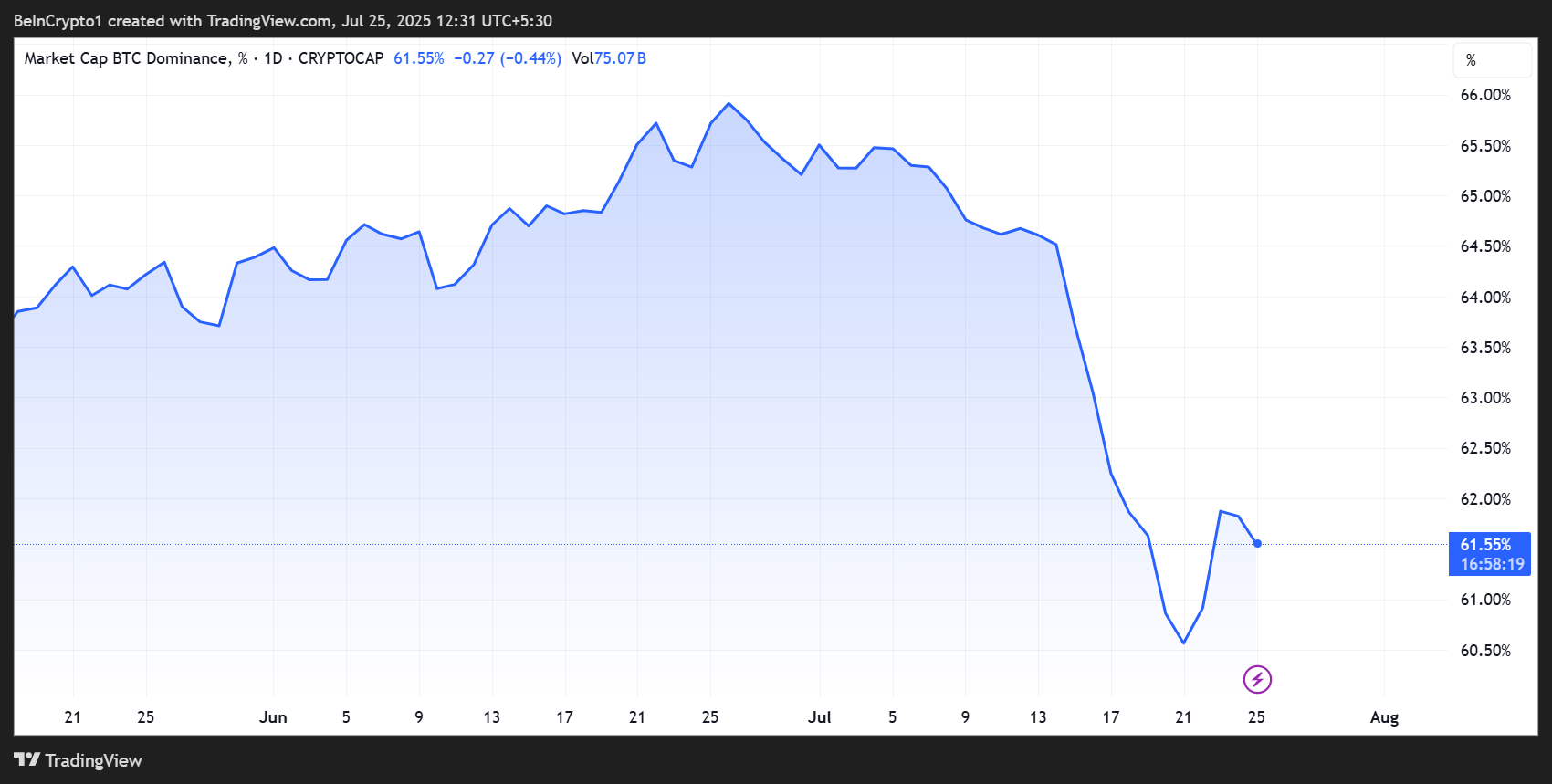 Бұл күту Bitcoin үстемдігінің күрт төмендеуімен сәйкес келеді. Бұл индекс 17 шілде мен 21 шілде аралығында 64%-дан 60%-ға дейін төмендеді.