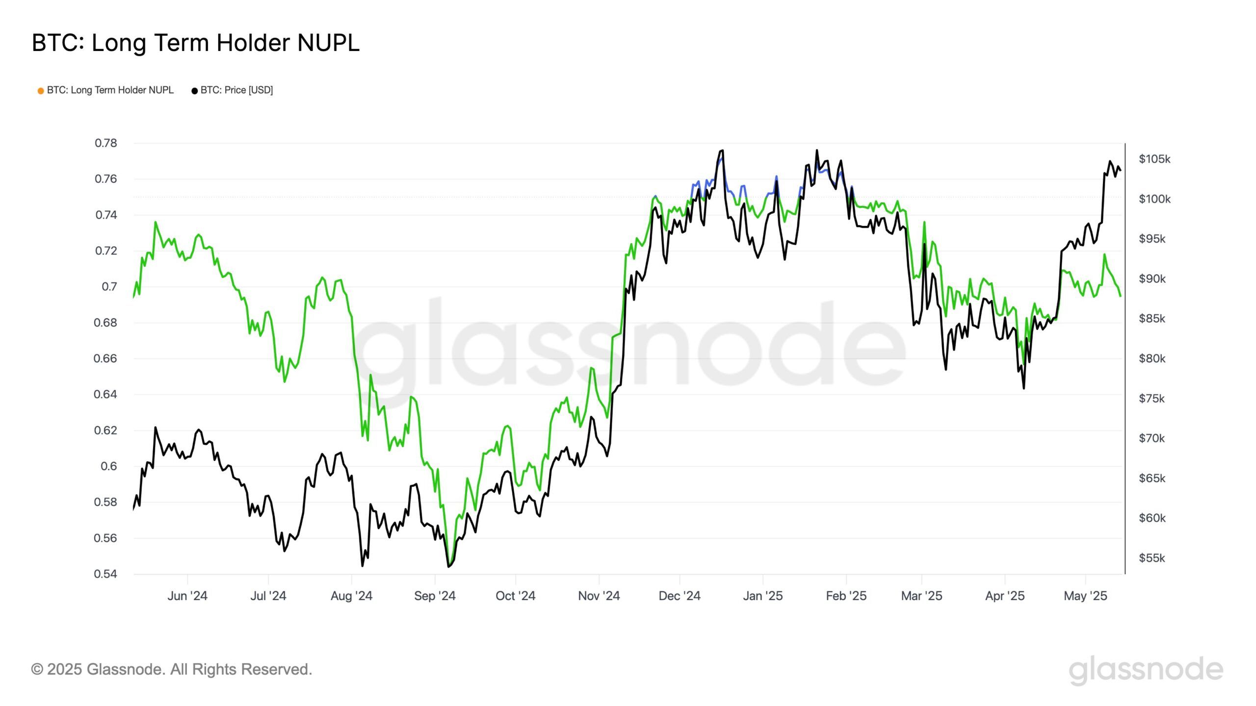 Ұзақ мерзімді иелердің (LTH) таза іске асырылмаған пайда/шығын (NUPL) көрсеткіші 2024 жылдың желтоқсанында биткоин сатып алған инвесторлар LTH-ға айналып жатқанын көрсетеді, бұл 155 күндік ұстау мерзімін талап етеді. Бұл биткоин үшін жағымды жағалық, себебі жетілген сатып алушылар әдетте монеталарды ұзақ уақыт ұстап, импульсивті сату қысымын азайтады.