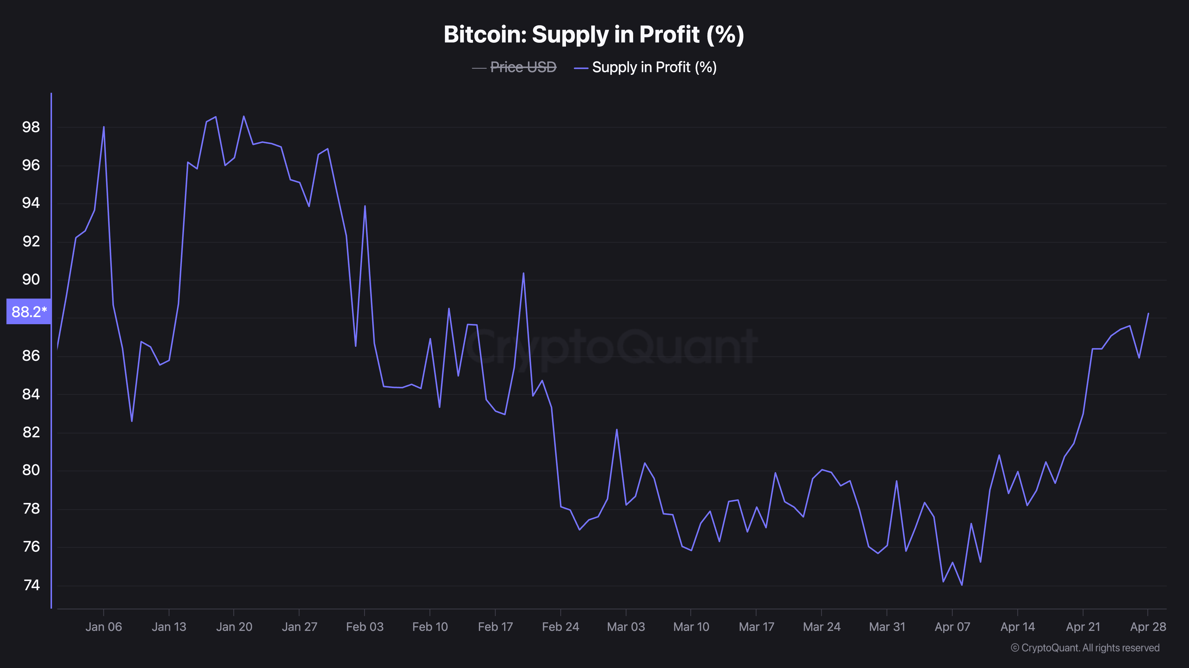Он-чейн деректері бойынша BTC-ның айналымдағы ұсынысының 85%-дан астамы қазір пайдада. Бұл тарихи бұқа сигналы болып табылады, бірақ көбінесе нарық циклдарындағы эйфориялық кезеңдердің басталуын білдіреді.