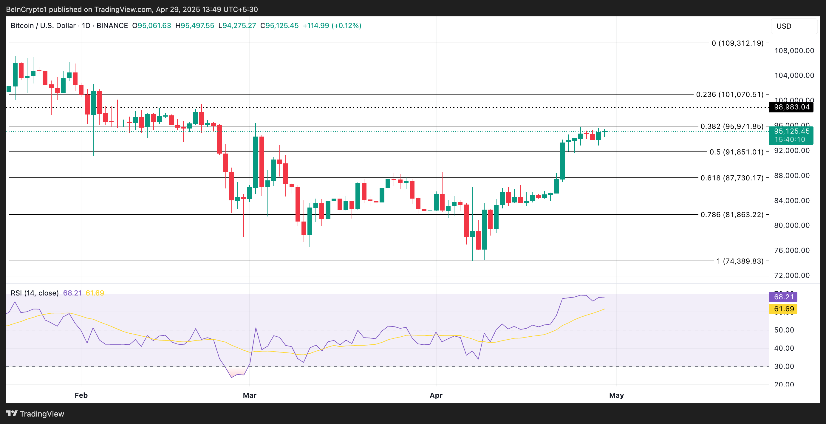 Жазу кезінде, негізгі монета 95 125 доллар деңгейінде саудаланып, 95 971 доллар негізгі қарсылық деңгейінен төмен тұр. Соңғы нарықтық құбылмалылыққа қарамастан, спот нарық қатысушылары арасында BTC-ға сұраныс айтарлықтай болып қалуда, бұл оның Салыстырмалы күш индексімен (RSI) көрінеді, ол қазір 68,21 деңгейінде тұр.