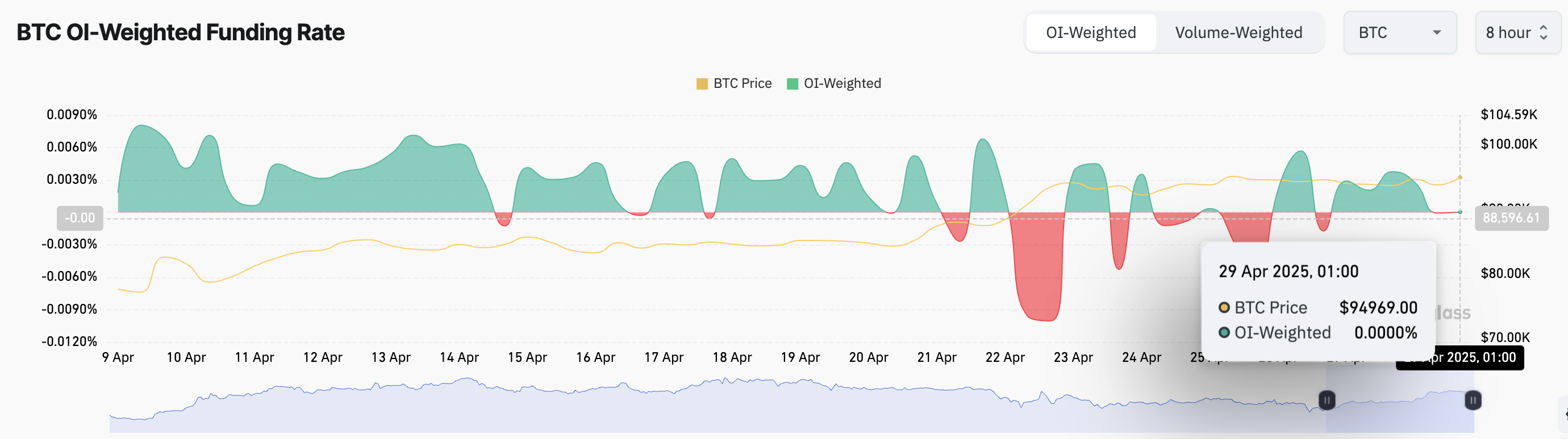 Қызықтысы, BTC-ның қаржыландыру мөлшерлемесі салыстырмалы түрде теңгерімді болып қалып отыр, бұл нарықтың күту жағдайында екенін көрсетеді. Жазу кезінде монетаның қаржыландыру мөлшерлемесі 0%.