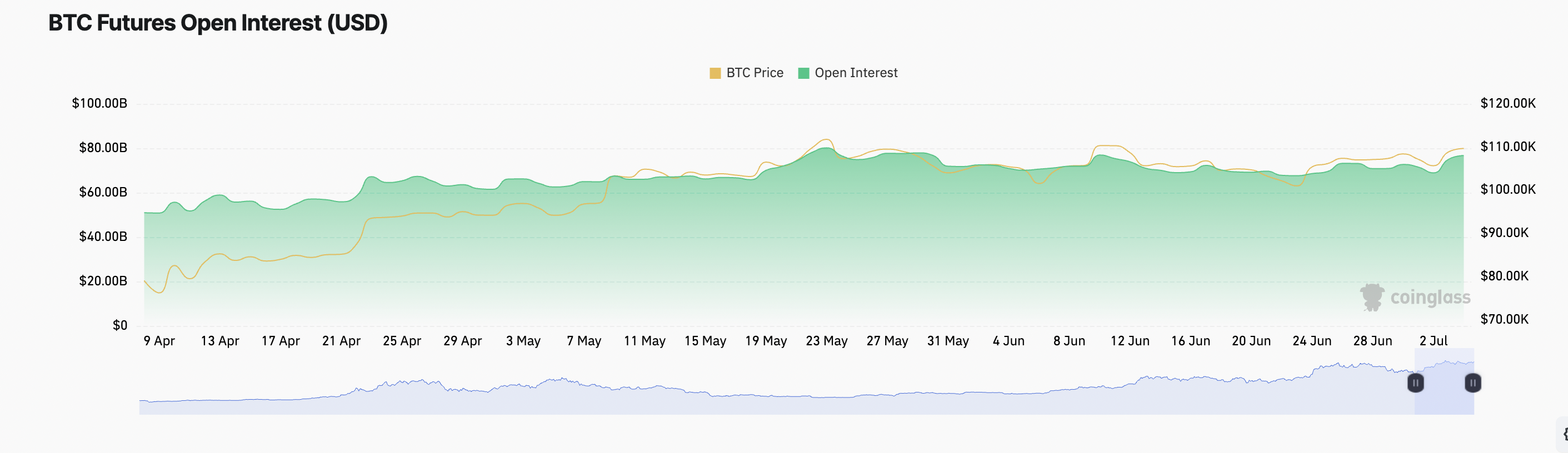 Сонымен қатар, сауда көлемінің төмендеуі аясында BTC бағасы шамамен 1%-ға төмендеді. Бірақ бұл құлдырау фьючерстердің ашық қызығушылығының (OI) өсуімен қатар жүреді, бұл трейдерлердің спот нарыққа қатысуы азайғанына қарамастан, левереджді ставкалар жасауды жалғастырып жатқанын көрсетеді.