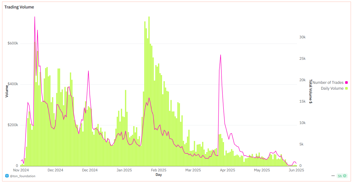 Сонымен қатар, Blum-ның күнделікті сауда көлемі 2025 жылы күрт төмендеді. Dune Analytics мәліметтері бойынша, Blum.io-дағы күнделікті сауда көлемі ақпанда 700 000 доллардан астам болса, маусымда шамамен 6 000 долларға дейін төмендеді.